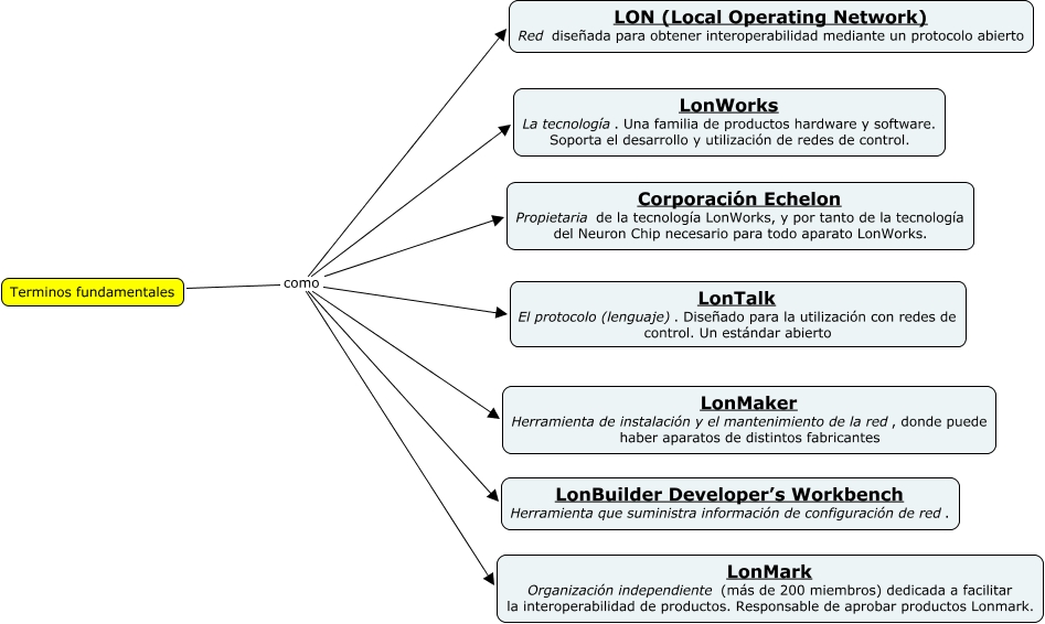 Este Cmap, tiene información relacionada con: Terminos Fundamentales, Terminos fundamentales como LonTalk El protocolo (lenguaje). Diseñado para la utilización con redes de control. Un estándar abierto, Terminos fundamentales como LonBuilder Developer’s Workbench Herramienta que suministra información de configuración de red., Terminos fundamentales como LON (Local Operating Network) Red diseñada para obtener interoperabilidad mediante un protocolo abierto, Terminos fundamentales como Corporación Echelon Propietaria de la tecnología LonWorks, y por tanto de la tecnología del Neuron Chip necesario para todo aparato LonWorks., Terminos fundamentales como LonWorks La tecnología. Una familia de productos hardware y software. Soporta el desarrollo y utilización de redes de control., Terminos fundamentales como LonMark Organización independiente (más de 200 miembros) dedicada a facilitar la interoperabilidad de productos. Responsable de aprobar productos Lonmark., Terminos fundamentales como LonMaker Herramienta de instalación y el mantenimiento de la red, donde puede haber aparatos de distintos fabricantes