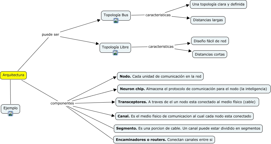 Este Cmap, tiene información relacionada con: Arquitectura, Arquitectura componentes Canal. Es el medio fisico de comunicacion al cual cada nodo esta conectado, Arquitectura componentes Encaminadores o routers. Conectan canales entre si, Arquitectura componentes Segmento. Es una porcion de cable. Un canal puede estar dividido en segmentos, Arquitectura puede ser Topología Bus, Topología Libre caracteristicas Distancias cortas, Arquitectura puede ser Topología Libre, Arquitectura componentes Transceptores. A traves de el un nodo esta conectado al medio físico (cable), Arquitectura Ejemplo, Arquitectura componentes Nodo. Cada unidad de comunicación en la red, Topología Libre caracteristicas Diseño fácil de red, Topología Bus caracteristicas Distancias largas, Arquitectura componentes Neuron chip. Almacena el protocolo de comunicación para el nodo (la inteligencia), Topología Bus caracteristicas Una topología clara y definida