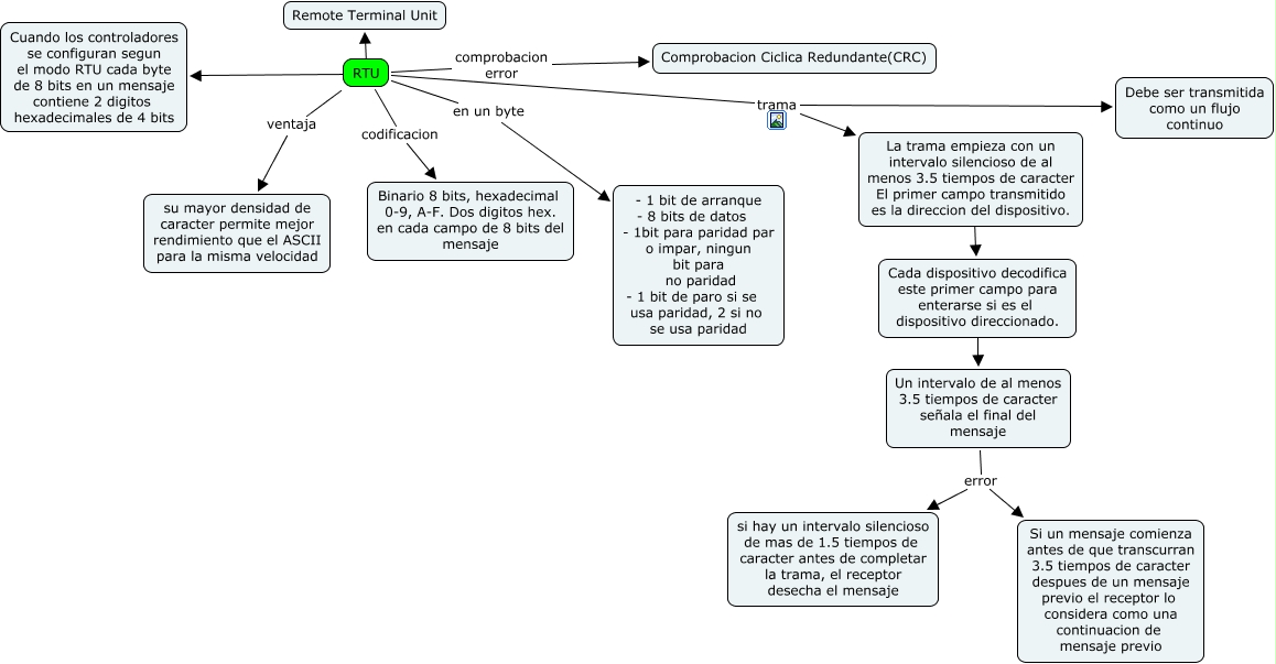 Este Cmap, tiene información relacionada con: RTU, RTU ???? Remote Terminal Unit, RTU trama Debe ser transmitida como un flujo continuo, Un intervalo de al menos 3.5 tiempos de caracter señala el final del mensaje error si hay un intervalo silencioso de mas de 1.5 tiempos de caracter antes de completar la trama, el receptor desecha el mensaje, Un intervalo de al menos 3.5 tiempos de caracter señala el final del mensaje error Si un mensaje comienza antes de que transcurran 3.5 tiempos de caracter despues de un mensaje previo el receptor lo considera como una continuacion de mensaje previo, RTU ventaja su mayor densidad de caracter permite mejor rendimiento que el ASCII para la misma velocidad, RTU codificacion Binario 8 bits, hexadecimal 0-9, A-F. Dos digitos hex. en cada campo de 8 bits del mensaje, RTU trama La trama empieza con un intervalo silencioso de al menos 3.5 tiempos de caracter El primer campo transmitido es la direccion del dispositivo., La trama empieza con un intervalo silencioso de al menos 3.5 tiempos de caracter El primer campo transmitido es la direccion del dispositivo. ???? Cada dispositivo decodifica este primer campo para enterarse si es el dispositivo direccionado., RTU ???? Cuando los controladores se configuran segun el modo RTU cada byte de 8 bits en un mensaje contiene 2 digitos hexadecimales de 4 bits, RTU en un byte - 1 bit de arranque - 8 bits de datos - 1bit para paridad par o impar, ningun bit para no paridad - 1 bit de paro si se usa paridad, 2 si no se usa paridad, RTU comprobacion error Comprobacion Ciclica Redundante(CRC), Cada dispositivo decodifica este primer campo para enterarse si es el dispositivo direccionado. ???? Un intervalo de al menos 3.5 tiempos de caracter señala el final del mensaje