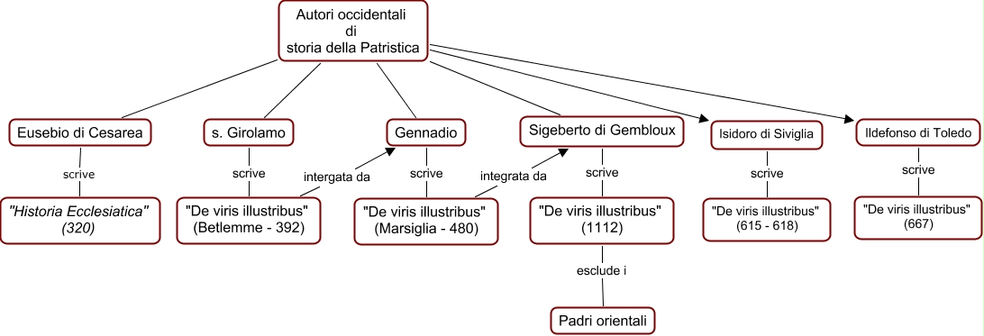 Questa Cmap, creata con IHMC CmapTools, contiene informazioni relative a: 02 Autori di storia dei Padri, Isidoro di Siviglia scrive "De viris illustribus" (615 - 618), s. Girolamo scrive "De viris illustribus" (Betlemme - 392), Autori occidentali di storia della Patristica Isidoro di Siviglia, Ildefonso di Toledo scrive "De viris illustribus" (667), Eusebio di Cesarea scrive "Historia Ecclesiatica" (320), Autori occidentali di storia della Patristica Ildefonso di Toledo, "De viris illustribus" (Betlemme - 392) intergata da Gennadio, "De viris illustribus" (Marsiglia - 480) integrata da Sigeberto di Gembloux, Autori occidentali di storia della Patristica Gennadio, Gennadio scrive "De viris illustribus" (Marsiglia - 480), Autori occidentali di storia della Patristica s. Girolamo, Autori occidentali di storia della Patristica Eusebio di Cesarea, Autori occidentali di storia della Patristica Sigeberto di Gembloux, Sigeberto di Gembloux scrive "De viris illustribus" (1112), "De viris illustribus" (1112) esclude i Padri orientali