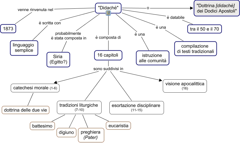 Questa Cmap, creata con IHMC CmapTools, contiene informazioni relative a: 21 Didachè, tradizioni liturgiche (7-10) preghiera (Pater), catechesi morale (1-6) dottrina delle due vie, "Didaché" o "Dottrina [didachè] dei Dodici Apostoli", 16 capitoli sono suddivisi in visione apocalittica (16), "Didaché" è databile tra il 50 e il 70, "Didaché" è una istruzione alle comunità, 16 capitoli sono suddivisi in esortazione disciplinare (11-15), "Didaché" è scritta con linguaggio semplice, 16 capitoli sono suddivisi in catechesi morale (1-6), "Didaché" è una compilazione di testi tradizionali, tradizioni liturgiche (7-10) digiuno, tradizioni liturgiche (7-10) battesimo, tradizioni liturgiche (7-10) eucaristia, "Didaché" venne rinvenuta nel 1873, "Didaché" probabilmente è stata composta in Siria (Egitto?), "Didaché" è composta di 16 capitoli, 16 capitoli sono suddivisi in tradizioni liturgiche (7-10)