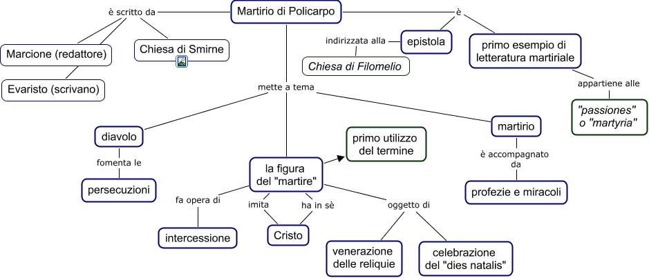 Questa Cmap, creata con IHMC CmapTools, contiene informazioni relative a: 25 Martirio di Policarpo, Martirio di Policarpo è scritto da Chiesa di Smirne, la figura del "martire" primo utilizzo del termine, martirio è accompagnato da profezie e miracoli, la figura del "martire" ha in sè Cristo, primo esempio di letteratura martiriale appartiene alle "passiones" o "martyria", la figura del "martire" oggetto di celebrazione del "dies natalis", Martirio di Policarpo è epistola, Martirio di Policarpo mette a tema la figura del "martire", Martirio di Policarpo mette a tema diavolo, Martirio di Policarpo è scritto da Evaristo (scrivano), Martirio di Policarpo mette a tema martirio, la figura del "martire" oggetto di venerazione delle reliquie, la figura del "martire" fa opera di intercessione, Martirio di Policarpo è scritto da Marcione (redattore), epistola indirizzata alla Chiesa di Filomelio, Martirio di Policarpo è primo esempio di letteratura martiriale, la figura del "martire" imita Cristo, diavolo fomenta le persecuzioni