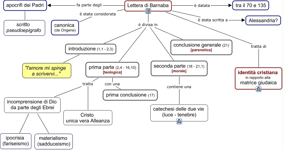 Questa Cmap, creata con IHMC CmapTools, contiene informazioni relative a: 27 Lettera di Barnaba, apocrifi dei Padri scritto pseudoepigrafo, prima parte (2,4 - 16,10) [teologica] tratta Cristo unica vera Alleanza, Lettera di Barnaba è stata scritta a Alessandria?, Lettera di Barnaba è divisa in seconda parte (18 - 21,1) [morale], Lettera di Barnaba fa parte degli apocrifi dei Padri, Lettera di Barnaba è divisa in prima parte (2,4 - 16,10) [teologica], Lettera di Barnaba è divisa in conclusione generale (21) [parenetica], prima parte (2,4 - 16,10) [teologica] con una prima conclusione (17), introduzione (1,1 - 2,3) "l'amore mi spinge a scrivervi...", Lettera di Barnaba è divisa in introduzione (1,1 - 2,3), incomprensione di Dio da parte degli Ebrei materialismo (sadduceismo), Lettera di Barnaba è stata considerata canonica (da Origene), Lettera di Barnaba tratta di identità cristiana in rapporto alla matrice giudaica, incomprensione di Dio da parte degli Ebrei ipocrisia (fariseismo), seconda parte (18 - 21,1) [morale] contiene una catechesi delle due vie (luce - tenebre), Lettera di Barnaba è datata tra il 70 e 135, prima parte (2,4 - 16,10) [teologica] tratta incomprensione di Dio da parte degli Ebrei
