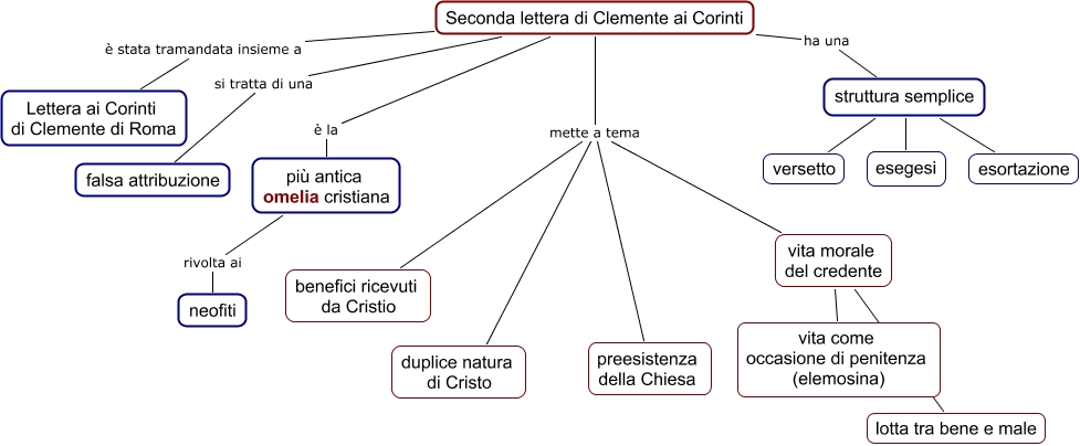 Questa Cmap, creata con IHMC CmapTools, contiene informazioni relative a: 29 Seconda lettera di Clemente romano, vita morale del credente lotta tra bene e male, Seconda lettera di Clemente ai Corinti è la più antica omelia cristiana, Seconda lettera di Clemente ai Corinti è stata tramandata insieme a Lettera ai Corinti di Clemente di Roma, struttura semplice versetto, Seconda lettera di Clemente ai Corinti mette a tema preesistenza della Chiesa, più antica omelia cristiana rivolta ai neofiti, struttura semplice esortazione, Seconda lettera di Clemente ai Corinti mette a tema duplice natura di Cristo, Seconda lettera di Clemente ai Corinti si tratta di una falsa attribuzione, Seconda lettera di Clemente ai Corinti mette a tema benefici ricevuti da Cristio, Seconda lettera di Clemente ai Corinti mette a tema vita morale del credente, Seconda lettera di Clemente ai Corinti ha una struttura semplice, vita morale del credente vita come occasione di penitenza (elemosina), struttura semplice esegesi