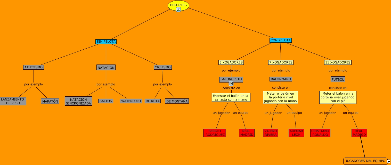 Este mapa conceptual ten información relativa a: deportes, 7 XOGADORES por ejemplo BALONMANO, CON PELOTA ???? 7 XOGADORES, NATACIÓN por ejemplo WATERPOLO, BALONCESTO consiste en Encestar el balón en la canasta con la mano, REAL MADRID ???? KARIM BENZEMÁ, FÚTBOL consiste en Meter el balón en la portería rival jugando con el pié, CON PELOTA ???? 5 XOGADORES, 11 XOGADORES por ejemplo FÚTBOL, CICLISMO por ejemplo DE MONTAÑA, Meter el balón en la portería rival jugando con el pié un jugador CRISTIANO RONALDO, SIN PELOTA ???? ATLETISMO, CON PELOTA ???? 11 XOGADORES, DEPORTES ???? SIN PELOTA, Meter el balón en la portería rival jugando con la mano un equipo ADEMAR LEÓN, Meter el balón en la portería rival jugando con el pié un equipo REAL MADRID, CICLISMO por ejemplo DE RUTA, REAL MADRID ???? CRISTIANO RONALDO, SIN PELOTA ???? NATACIÓN, Encestar el balón en la canasta con la mano un equipo REAL MADRID, DEPORTES ???? CON PELOTA