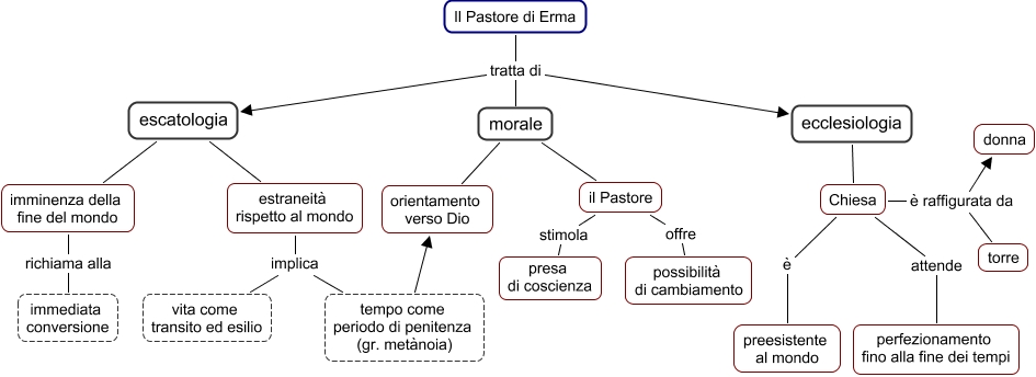 Questa Cmap, creata con IHMC CmapTools, contiene informazioni relative a: 31 Il Pastore di Erma - Temi, Il Pastore di Erma tratta di escatologia, escatologia imminenza della fine del mondo, Il Pastore di Erma tratta di ecclesiologia, estraneità rispetto al mondo implica vita come transito ed esilio, estraneità rispetto al mondo implica tempo come periodo di penitenza (gr. metànoia), escatologia estraneità rispetto al mondo, il Pastore stimola presa di coscienza, morale il Pastore, Chiesa è raffigurata da torre, imminenza della fine del mondo richiama alla immediata conversione, Il Pastore di Erma tratta di morale, Chiesa è raffigurata da donna, morale orientamento verso Dio, tempo come periodo di penitenza (gr. metànoia) orientamento verso Dio, Chiesa è preesistente al mondo, Chiesa attende perfezionamento fino alla fine dei tempi, il Pastore offre possibilità di cambiamento, ecclesiologia Chiesa