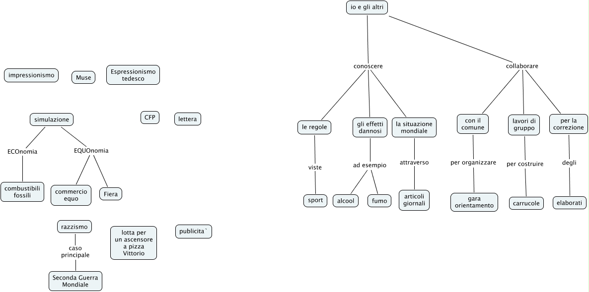 Questa Cmap, creata con IHMC CmapTools, contiene informazioni relative a: io e gli altri felix, le regole viste sport, simulazione ECOnomia combustibili fossili, la situazione mondiale attraverso articoli giornali, io e gli altri conoscere la situazione mondiale, io e gli altri collaborare con il comune, gli effetti dannosi ad esempio fumo, simulazione EQUOnomia commercio equo, razzismo caso principale Seconda Guerra Mondiale, io e gli altri conoscere le regole, Fiera EQUOnomia commercio equo, per la correzione degli elaborati, io e gli altri collaborare per la correzione, lavori di gruppo per costruire carrucole, io e gli altri collaborare lavori di gruppo, gli effetti dannosi ad esempio alcool, io e gli altri conoscere gli effetti dannosi, con il comune per organizzare gara orientamento