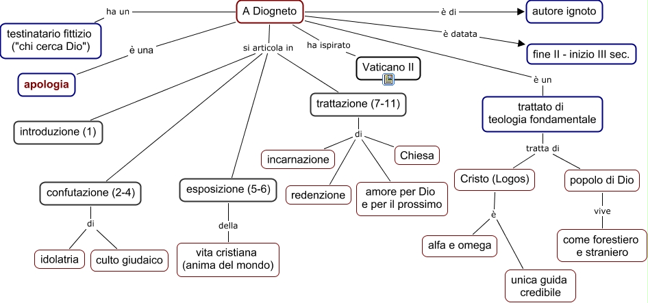 Questa Cmap, creata con IHMC CmapTools, contiene informazioni relative a: 32 A Diogneto, confutazione (2-4) di culto giudaico, A Diogneto si articola in introduzione (1), A Diogneto si articola in confutazione (2-4), A Diogneto è un trattato di teologia fondamentale, popolo di Dio vive come forestiero e straniero, A Diogneto ha ispirato Vaticano II, A Diogneto è di autore ignoto, Cristo (Logos) è alfa e omega, trattazione (7-11) di amore per Dio e per il prossimo, A Diogneto è una apologia, A Diogneto si articola in esposizione (5-6), trattato di teologia fondamentale tratta di Cristo (Logos), esposizione (5-6) della vita cristiana (anima del mondo), A Diogneto si articola in trattazione (7-11), A Diogneto ha un testinatario fittizio ("chi cerca Dio"), trattazione (7-11) di incarnazione, trattazione (7-11) di redenzione, Cristo (Logos) è unica guida credibile, confutazione (2-4) di idolatria, trattato di teologia fondamentale tratta di popolo di Dio