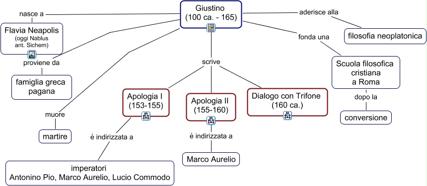 Questa Cmap, creata con IHMC CmapTools, contiene informazioni relative a: 34 Giustino, Giustino (100 ca. - 165) fonda una Scuola filosofica cristiana a Roma, Giustino (100 ca. - 165) scrive Apologia II (155-160), Giustino (100 ca. - 165) scrive Dialogo con Trifone (160 ca.), Scuola filosofica cristiana a Roma dopo la conversione, Apologia II (155-160) è indirizzata a Marco Aurelio, Giustino (100 ca. - 165) proviene da famiglia greca pagana, Apologia I (153-155) è indirizzata a imperatori Antonino Pio, Marco Aurelio, Lucio Commodo, Giustino (100 ca. - 165) muore martire, Giustino (100 ca. - 165) nasce a Flavia Neapolis (oggi Nablus ant. Sichem), Giustino (100 ca. - 165) scrive Apologia I (153-155), Giustino (100 ca. - 165) aderisce alla filosofia neoplatonica