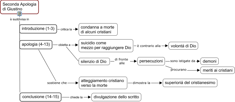 Questa Cmap, creata con IHMC CmapTools, contiene informazioni relative a: 36 Giustino - Apologia II, atteggiamento cristiano verso la morte dimostra la superiorià del cristianesimo, apologia (4-13) obietta a suicidio come mezzo per raggiungere Dio, suicidio come mezzo per raggiungere Dio è contrario alla volontà di Dio, introduzione (1-3) critica la condanna a morte di alcuni cristiani, apologia (4-13) sostiene che atteggiamento cristiano verso la morte, persecuzioni procurano meriti ai cristiani, apologia (4-13) obietta a silenzio di Dio, Seconda Apologia di Giustino è suddivisa in conclusione (14-15), Seconda Apologia di Giustino è suddivisa in introduzione (1-3), silenzio di Dio di fronte alle persecuzioni, persecuzioni sono istigate da demoni, conclusione (14-15) chiede la divulgazione dello scritto, Seconda Apologia di Giustino è suddivisa in apologia (4-13)