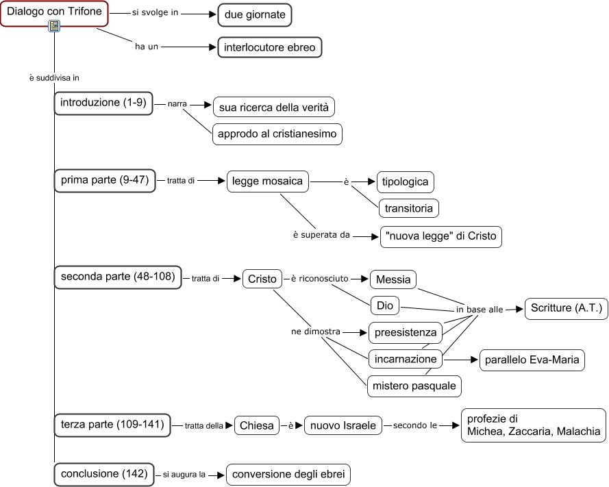 Questa Cmap, creata con IHMC CmapTools, contiene informazioni relative a: 37 Giustino - Dialogo con Trifone, mistero pasquale in base alle Scritture (A.T.), Dio in base alle Scritture (A.T.), Cristo è riconosciuto Dio, conclusione (142) si augura la conversione degli ebrei, Dialogo con Trifone è suddivisa in seconda parte (48-108), seconda parte (48-108) tratta di Cristo, preesistenza in base alle Scritture (A.T.), terza parte (109-141) tratta della Chiesa, introduzione (1-9) narra sua ricerca della verità, Dialogo con Trifone è suddivisa in terza parte (109-141), Cristo è riconosciuto Messia, incarnazione parallelo Eva-Maria, Dialogo con Trifone è suddivisa in introduzione (1-9), Dialogo con Trifone è suddivisa in conclusione (142), Cristo ne dimostra incarnazione, Cristo ne dimostra preesistenza, legge mosaica è tipologica, legge mosaica è transitoria, legge mosaica è superata da "nuova legge" di Cristo, Dialogo con Trifone ha un interlocutore ebreo