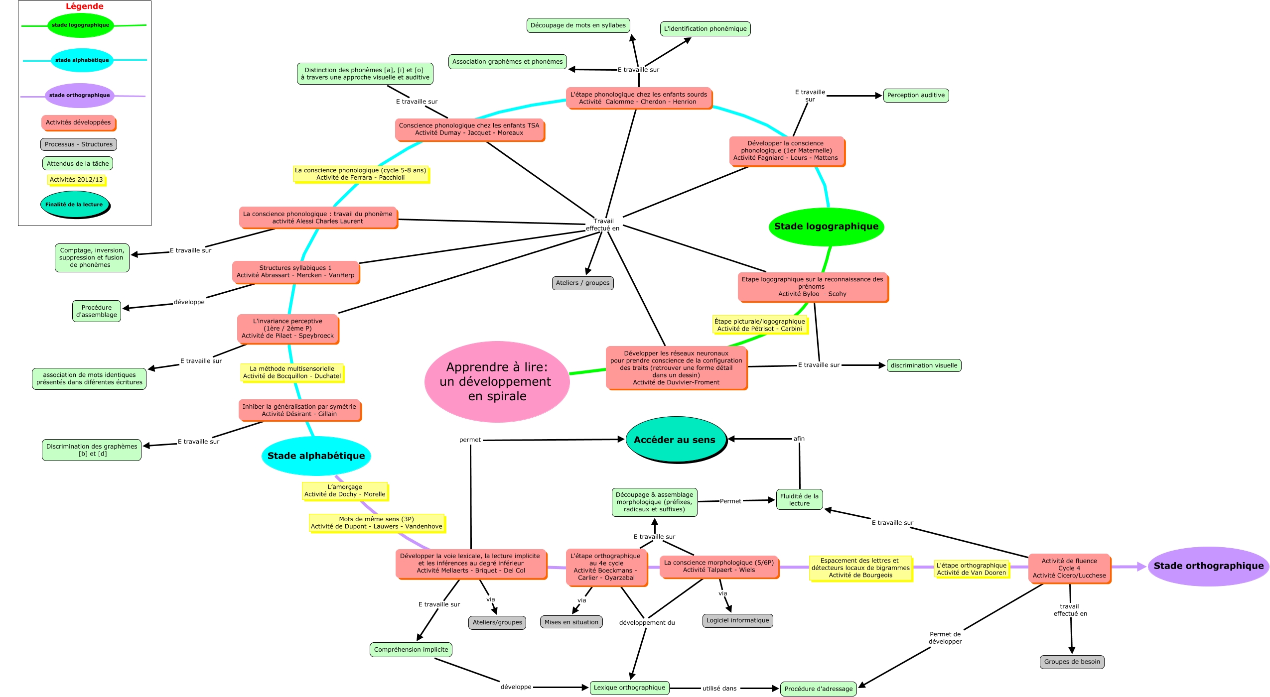 Cette carte de concepts créée avec IHMC CmapTools traite de: français 3, L'invariance perceptive (1ère / 2ème P) Activité de Pilaet - Speybroeck Travail effectué en Ateliers / groupes, Activité de fluence Cycle 4 Activité Cicero/Lucchese E travaille sur Fluidité de la lecture, Structures syllabiques 1 Activité Abrassart - Mercken - VanHerp développe Procédure d'assemblage, Activité de fluence Cycle 4 Activité Cicero/Lucchese Permet de développer Procédure d'adressage, Etape logographique sur la reconnaissance des prénoms Activité Byloo - Scohy Travail effectué en Ateliers / groupes, La conscience morphologique (5/6P) Activité Talpaert - Wiels développement du Lexique orthographique, L'étape orthographique au 4e cycle Activité Boeckmans - Carlier - Oyarzabal via Mises en situation, L'étape orthographique au 4e cycle Activité Boeckmans - Carlier - Oyarzabal développement du Lexique orthographique, Développer la voie lexicale, la lecture implicite et les inférences au degré inférieur Activité Mellaerts - Briquet - Del Col permet Accéder au sens, Activité de fluence Cycle 4 Activité Cicero/Lucchese travail effectué en Groupes de besoin, Lexique orthographique utilisé dans Procédure d'adressage, stade alphabétique ????, L'étape phonologique chez les enfants sourds Activité Calomme - Cherdon - Henrion E travaille sur Découpage de mots en syllabes, stade logographique ????, Structures syllabiques 1 Activité Abrassart - Mercken - VanHerp Travail effectué en Ateliers / groupes, Développer la conscience phonologique (1er Maternelle) Activité Fagniard - Leurs - Mattens E travaille sur Perception auditive, Développer la conscience phonologique (1er Maternelle) Activité Fagniard - Leurs - Mattens Travail effectué en Ateliers / groupes, stade orthographique ???? ????, La conscience phonologique : travail du phonème activité Alessi Charles Laurent Travail effectué en Ateliers / groupes, Développer la voie lexicale, la lecture implicite et les inférences au degré inférieur Activité Mellaerts - Briquet - Del Col E travaille sur Compréhension implicite