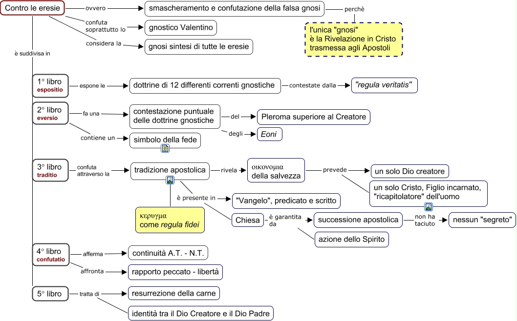 Questa Cmap, creata con IHMC CmapTools, contiene informazioni relative a: 39 Ireneo - Contro le eresie, 4° libro confutatio afferma continuità A.T. - N.T., tradizione apostolica è presente in Chiesa, 3° libro traditio confuta attraverso la tradizione apostolica, Chiesa è garantita da successione apostolica, Chiesa è garantita da azione dello Spirito, 1° libro espositio espone le dottrine di 12 differenti correnti gnostiche, Contro le eresie è suddivisa in 5° libro, Contro le eresie è suddivisa in 2° libro eversio, 4° libro confutatio affronta rapporto peccato - libertà, οικονομια della salvezza prevede un solo Dio creatore, οικονομια della salvezza prevede un solo Cristo, Figlio incarnato, "ricapitolatore" dell'uomo, smascheramento e confutazione della falsa gnosi perchè l'unica "gnosi" è la Rivelazione in Cristo trasmessa agli Apostoli, 2° libro eversio contiene un simbolo della fede, 5° libro tratta di identità tra il Dio Creatore e il Dio Padre, tradizione apostolica è presente in "Vangelo", predicato e scritto, Contro le eresie confuta soprattutto lo gnostico Valentino, Contro le eresie considera la gnosi sintesi di tutte le eresie, 5° libro tratta di resurrezione della carne, Contro le eresie è suddivisa in 4° libro confutatio, contestazione puntuale delle dottrine gnostiche degli Eoni