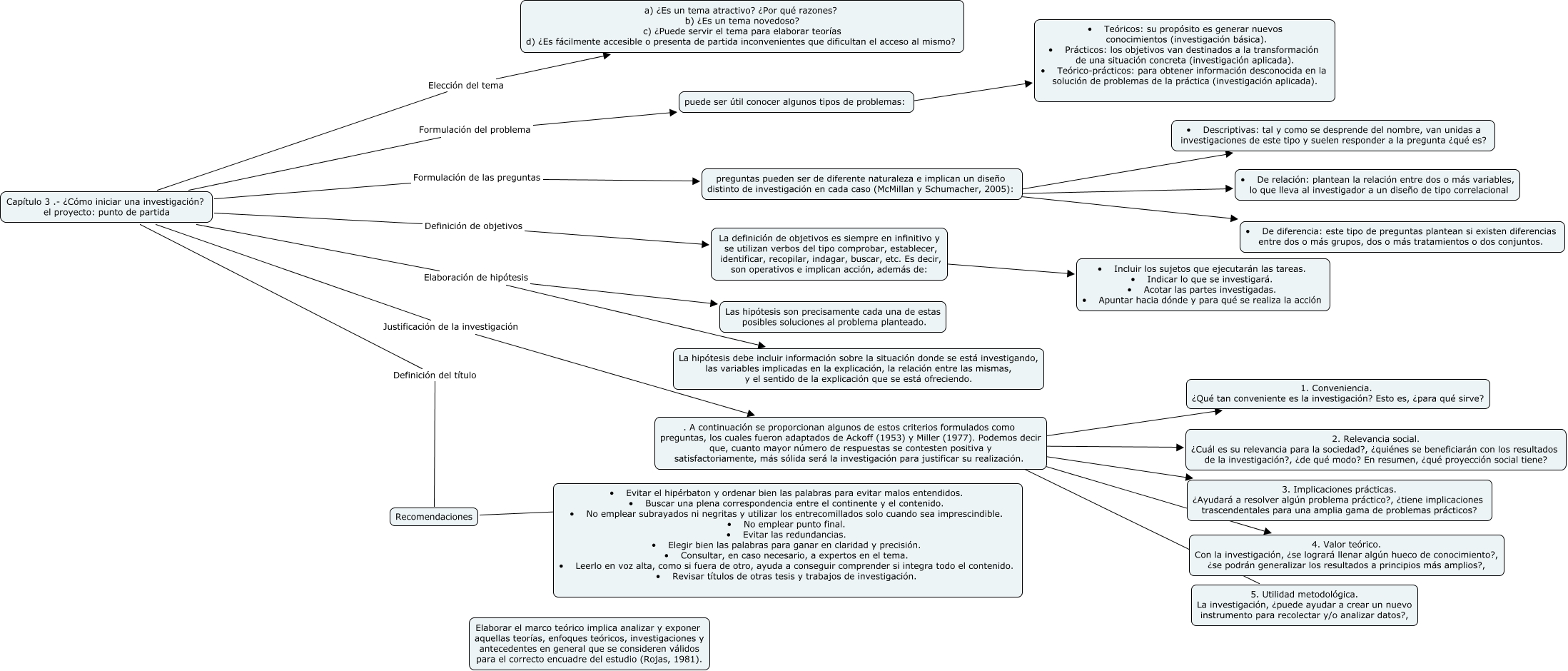 Este Cmap, tiene información relacionada con: Capítulo 3- Cómo iniciar una investigación, puede ser útil conocer algunos tipos de problemas: ???? • Teóricos: su propósito es generar nuevos conocimientos (investigación básica). • Prácticos: los objetivos van destinados a la transformación de una situación concreta (investigación aplicada). • Teórico-prácticos: para obtener información desconocida en la solución de problemas de la práctica (investigación aplicada)., preguntas pueden ser de diferente naturaleza e implican un diseño distinto de investigación en cada caso (McMillan y Schumacher, 2005): ???? • De diferencia: este tipo de preguntas plantean si existen diferencias entre dos o más grupos, dos o más tratamientos o dos conjuntos., . A continuación se proporcionan algunos de estos criterios formulados como preguntas, los cuales fueron adaptados de Ackoff (1953) y Miller (1977). Podemos decir que, cuanto mayor número de respuestas se contesten positiva y satisfactoriamente, más sólida será la investigación para justificar su realización. ???? 4. Valor teórico. Con la investigación, ¿se logrará llenar algún hueco de conocimiento?, ¿se podrán generalizar los resultados a principios más amplios?,, preguntas pueden ser de diferente naturaleza e implican un diseño distinto de investigación en cada caso (McMillan y Schumacher, 2005): ???? • De relación: plantean la relación entre dos o más variables, lo que lleva al investigador a un diseño de tipo correlacional, preguntas pueden ser de diferente naturaleza e implican un diseño distinto de investigación en cada caso (McMillan y Schumacher, 2005): ???? • Descriptivas: tal y como se desprende del nombre, van unidas a investigaciones de este tipo y suelen responder a la pregunta ¿qué es?, La definición de objetivos es siempre en infinitivo y se utilizan verbos del tipo comprobar, establecer, identificar, recopilar, indagar, buscar, etc. Es decir, son operativos e implican acción, además de: ???? • Incluir los sujetos que ejecutarán las tareas. • Indicar lo que se investigará. • Acotar las partes investigadas. • Apuntar hacia dónde y para qué se realiza la acción, Capítulo 3 .- ¿Cómo iniciar una investigación? el proyecto: punto de partida Elaboración de hipótesis Las hipótesis son precisamente cada una de estas posibles soluciones al problema planteado., . A continuación se proporcionan algunos de estos criterios formulados como preguntas, los cuales fueron adaptados de Ackoff (1953) y Miller (1977). Podemos decir que, cuanto mayor número de respuestas se contesten positiva y satisfactoriamente, más sólida será la investigación para justificar su realización. ???? 2. Relevancia social. ¿Cuál es su relevancia para la sociedad?, ¿quiénes se beneficiarán con los resultados de la investigación?, ¿de qué modo? En resumen, ¿qué proyección social tiene?, Capítulo 3 .- ¿Cómo iniciar una investigación? el proyecto: punto de partida Formulación del problema puede ser útil conocer algunos tipos de problemas:, . A continuación se proporcionan algunos de estos criterios formulados como preguntas, los cuales fueron adaptados de Ackoff (1953) y Miller (1977). Podemos decir que, cuanto mayor número de respuestas se contesten positiva y satisfactoriamente, más sólida será la investigación para justificar su realización. ???? 3. Implicaciones prácticas. ¿Ayudará a resolver algún problema práctico?, ¿tiene implicaciones trascendentales para una amplia gama de problemas prácticos?, . A continuación se proporcionan algunos de estos criterios formulados como preguntas, los cuales fueron adaptados de Ackoff (1953) y Miller (1977). Podemos decir que, cuanto mayor número de respuestas se contesten positiva y satisfactoriamente, más sólida será la investigación para justificar su realización. ???? 3. Implicaciones prácticas. ¿Ayudará a resolver algún problema práctico?, ¿tiene implicaciones trascendentales para una amplia gama de problemas prácticos?, . A continuación se proporcionan algunos de estos criterios formulados como preguntas, los cuales fueron adaptados de Ackoff (1953) y Miller (1977). Podemos decir que, cuanto mayor número de respuestas se contesten positiva y satisfactoriamente, más sólida será la investigación para justificar su realización. ???? 5. Utilidad metodológica. La investigación, ¿puede ayudar a crear un nuevo instrumento para recolectar y/o analizar datos?,, . A continuación se proporcionan algunos de estos criterios formulados como preguntas, los cuales fueron adaptados de Ackoff (1953) y Miller (1977). Podemos decir que, cuanto mayor número de respuestas se contesten positiva y satisfactoriamente, más sólida será la investigación para justificar su realización. ???? 5. Utilidad metodológica. La investigación, ¿puede ayudar a crear un nuevo instrumento para recolectar y/o analizar datos?,, Capítulo 3 .- ¿Cómo iniciar una investigación? el proyecto: punto de partida Formulación de las preguntas preguntas pueden ser de diferente naturaleza e implican un diseño distinto de investigación en cada caso (McMillan y Schumacher, 2005):, . A continuación se proporcionan algunos de estos criterios formulados como preguntas, los cuales fueron adaptados de Ackoff (1953) y Miller (1977). Podemos decir que, cuanto mayor número de respuestas se contesten positiva y satisfactoriamente, más sólida será la investigación para justificar su realización. ???? 1. Conveniencia. ¿Qué tan conveniente es la investigación? Esto es, ¿para qué sirve?, Recomendaciones ???? • Evitar el hipérbaton y ordenar bien las palabras para evitar malos entendidos. • Buscar una plena correspondencia entre el continente y el contenido. • No emplear subrayados ni negritas y utilizar los entrecomillados solo cuando sea imprescindible. • No emplear punto final. • Evitar las redundancias. • Elegir bien las