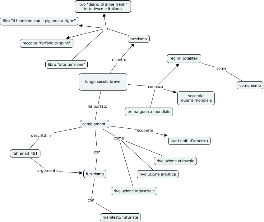 Questa Cmap, creata con IHMC CmapTools, contiene informazioni relative a: lungo secolo breve cristiana, razzismo in raccolta "farfalle di spine", lungo secolo breve conosco regimi totalitari, lungo secolo breve rispetto razzismo, cambiamenti come rivoluzione culturale, lungo secolo breve conosco prima guerra mondiale, fahrenait 451 argomento futurismo, futurismo con manifesto futurista, cambiamenti descritti in fahrenait 451, cambiamenti scoperte stati uniti d'america, razzismo in libro "alta tensione", lungo secolo breve ha portato cambiamenti, regimi totalitari come comunismo, razzismo in film "il bambino con il pigiama a righe", lungo secolo breve conosco seconda guerra mondiale, cambiamenti come rivoluzione artistica, razzismo in libro "diario di anne frank" in tedesco e italiano, cambiamenti con futurismo, cambiamenti come rivoluzione industriale