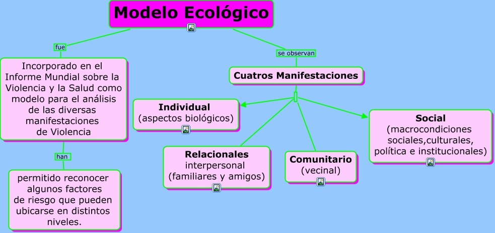 Este Cmap, tiene información relacionada con: Modelo Ecologico, Cuatros Manifestaciones Comunitario (vecinal), Incorporado en el Informe Mundial sobre la Violencia y la Salud como modelo para el análisis de las diversas manifestaciones de Violencia han permitido reconocer algunos factores de riesgo que pueden ubicarse en distintos niveles., Cuatros Manifestaciones Social (macrocondiciones sociales,culturales, política e institucionales), Modelo Ecológico fue Incorporado en el Informe Mundial sobre la Violencia y la Salud como modelo para el análisis de las diversas manifestaciones de Violencia, Modelo Ecológico se observan Cuatros Manifestaciones, Cuatros Manifestaciones Relacionales interpersonal (familiares y amigos), Cuatros Manifestaciones Individual (aspectos biológicos)