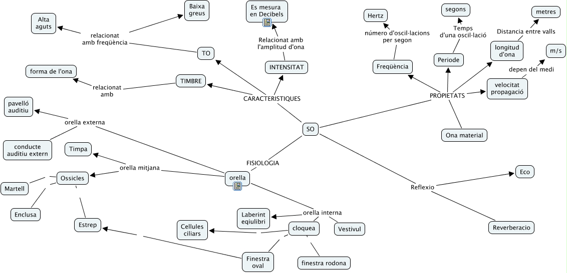 Aquest mapa conceptual conté informació relacionada amb: So, orella orella externa conducte auditiu extern, cloquea Finestra oval, Periode Temps d'una oscil·lació segons, orella orella externa pavelló auditiu, Finestra oval Estrep, Ossicles Martell, SO PROPIETATS Freqüència, Estrep Ossicles, SO Reflexio Reverberacio, SO Reflexio Eco, orella orella interna Vestivul, orella orella mitjana Ossicles, TO relacionat amb freqüència Alta aguts, SO PROPIETATS Ona material, TO relacionat amb freqüència Baixa greus, orella orella interna Laberint eqiulibri, SO FISIOLOGIA orella, SO PROPIETATS Periode, orella orella mitjana Timpa, INTENSITAT Relacionat amb l'amplitud d'ona Es mesura en Decibels