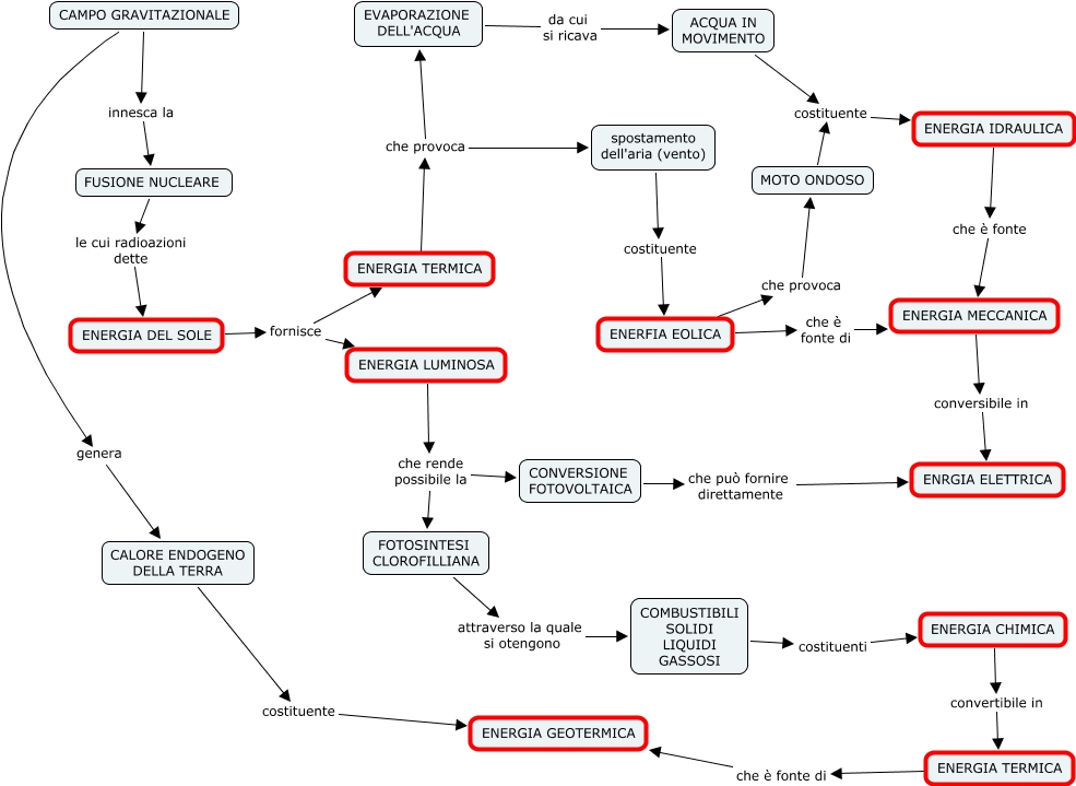 Questa Cmap, creata con IHMC CmapTools, contiene informazioni relative a: ENERGIA, ENERFIA EOLICA che è fonte di ENERGIA MECCANICA, ENERGIA LUMINOSA che rende possibile la FOTOSINTESI CLOROFILLIANA, FOTOSINTESI CLOROFILLIANA attraverso la quale si otengono COMBUSTIBILI SOLIDI LIQUIDI GASSOSI, ENERGIA CHIMICA convertibile in ENERGIA TERMICA, ENERFIA EOLICA che provoca MOTO ONDOSO, spostamento dell'aria (vento) costituente ENERFIA EOLICA, FUSIONE NUCLEARE le cui radioazioni dette ENERGIA DEL SOLE, MOTO ONDOSO costituente ENERGIA IDRAULICA, ENERGIA TERMICA che provoca EVAPORAZIONE DELL'ACQUA, ENERGIA TERMICA che è fonte di ENERGIA GEOTERMICA, CONVERSIONE FOTOVOLTAICA che può fornire direttamente ENRGIA ELETTRICA, ENERGIA DEL SOLE fornisce ENERGIA TERMICA, ENERGIA IDRAULICA che è fonte ENERGIA MECCANICA, EVAPORAZIONE DELL'ACQUA da cui si ricava ACQUA IN MOVIMENTO, CAMPO GRAVITAZIONALE innesca la FUSIONE NUCLEARE, ENERGIA MECCANICA conversibile in ENRGIA ELETTRICA, ENERGIA TERMICA che provoca spostamento dell'aria (vento), COMBUSTIBILI SOLIDI LIQUIDI GASSOSI costituenti ENERGIA CHIMICA, CAMPO GRAVITAZIONALE genera CALORE ENDOGENO DELLA TERRA, CALORE ENDOGENO DELLA TERRA costituente ENERGIA GEOTERMICA