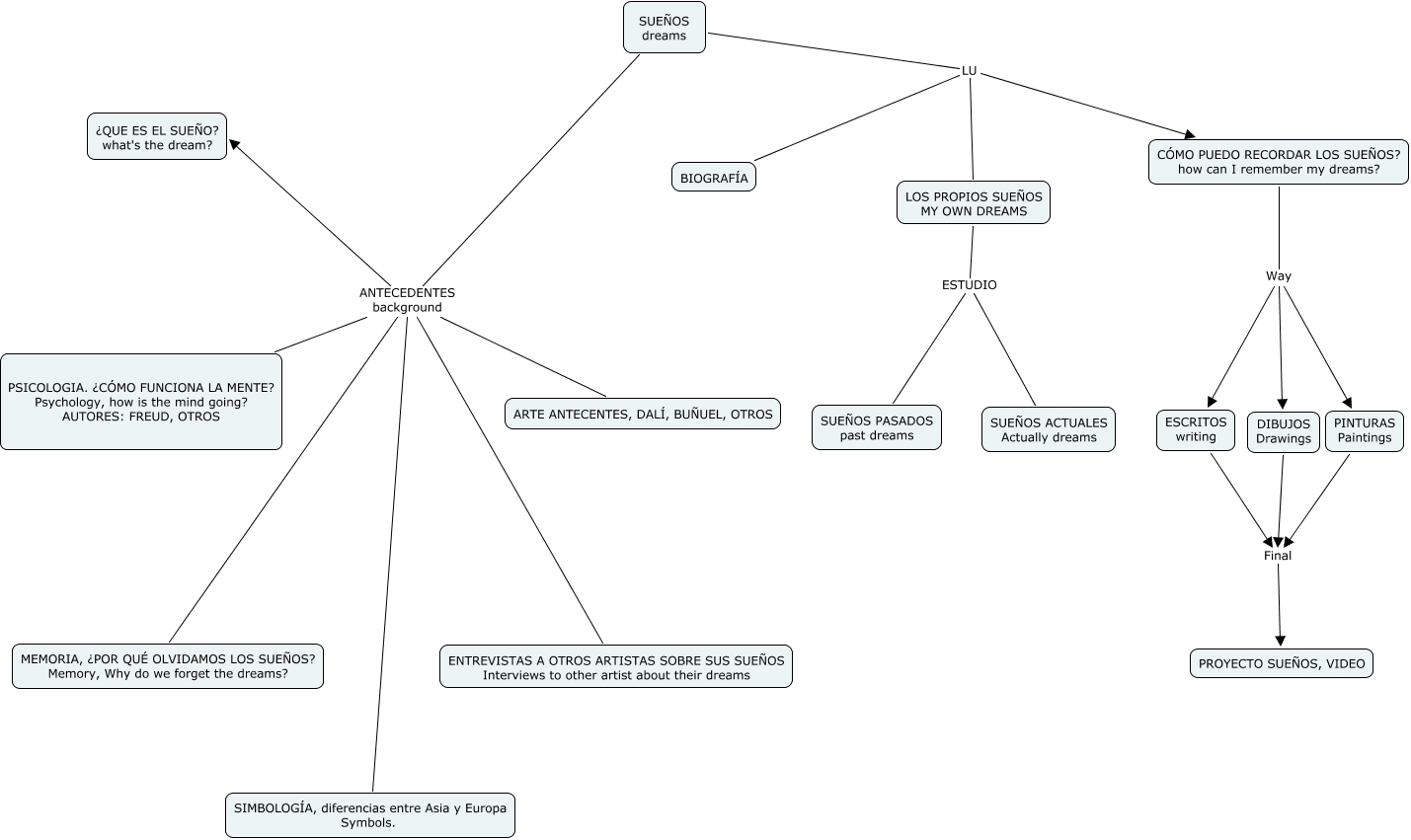 此概念图以 IHMC CmapTools 创建, 内含信息有关于: Lu,Yu'Han, SUEÑOS dreams LU CÓMO PUEDO RECORDAR LOS SUEÑOS? how can I remember my dreams?, PINTURAS Paintings Final PROYECTO SUEÑOS, VIDEO, LOS PROPIOS SUEÑOS MY OWN DREAMS ESTUDIO SUEÑOS PASADOS past dreams, SUEÑOS dreams ANTECEDENTES background MEMORIA, ¿POR QUÉ OLVIDAMOS LOS SUEÑOS? Memory, Why do we forget the dreams?, SUEÑOS dreams LU LOS PROPIOS SUEÑOS MY OWN DREAMS, ESCRITOS writing Final PROYECTO SUEÑOS, VIDEO, SUEÑOS dreams LU BIOGRAFÍA, SUEÑOS dreams ANTECEDENTES background PSICOLOGIA. ¿CÓMO FUNCIONA LA MENTE? Psychology, how is the mind going? AUTORES: FREUD, OTROS, LOS PROPIOS SUEÑOS MY OWN DREAMS ESTUDIO SUEÑOS ACTUALES Actually dreams, SUEÑOS dreams ANTECEDENTES background ¿QUE ES EL SUEÑO? what's the dream?, CÓMO PUEDO RECORDAR LOS SUEÑOS? how can I remember my dreams? Way DIBUJOS Drawings, SUEÑOS dreams ANTECEDENTES background SIMBOLOGÍA, diferencias entre Asia y Europa Symbols., DIBUJOS Drawings Final PROYECTO SUEÑOS, VIDEO, CÓMO PUEDO RECORDAR LOS SUEÑOS? how can I remember my dreams? Way ESCRITOS writing, SUEÑOS dreams ANTECEDENTES background ENTREVISTAS A OTROS ARTISTAS SOBRE SUS SUEÑOS Interviews to other artist about their dreams, SUEÑOS dreams ANTECEDENTES background ARTE ANTECENTES, DALÍ, BUÑUEL, OTROS, CÓMO PUEDO RECORDAR LOS SUEÑOS? how can I remember my dreams? Way PINTURAS Paintings