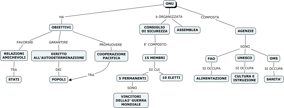 Questa Cmap, creata con IHMC CmapTools, contiene informazioni relative a: ONU, 15 MEMBRI DI CUI 10 ELETTI, AGENZIE SONO UNESCO, 5 PERMANENTI SONO VINCITORI DELLA2° GUERRA MONDIALE, OBIETTIVI PROMUOVERE COOPERAZIONE PACIFICA, AGENZIE SONO FAO, ONU è ORGANIZZATA CONSIGLIO DI SICUREZZA, AGENZIE SONO OMS, FAO SI OCCUPA ALIMENTAZIONE, UNESCO SI OCCUPA CULTURA E ISTRUZIONE, ONU HA OBIETTIVI, OBIETTIVI FAVORIRE RELAZIONI AMICHEVOLI, 15 MEMBRI DI CUI 5 PERMANENTI, RELAZIONI AMICHEVOLI TRA STATI, CONSIGLIO DI SICUREZZA E' COMPOSTO 15 MEMBRI, ONU è ORGANIZZATA ASSEMBLEA, DIRITTO ALL'AUTODETERMINAZIONE DEI POPOLI, ONU COMPOSTA AGENZIE, OMS SI OCCUPA SANITA', OBIETTIVI GARANTIRE DIRITTO ALL'AUTODETERMINAZIONE, COOPERAZIONE PACIFICA TRA POPOLI