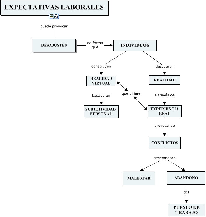 Este Cmap, tiene información relacionada con: DESAJUSTES, REALIDAD a través de EXPERIENCIA REAL, REALIDAD VIRTUAL basada en SUBJETIVIDAD PERSONAL, EXPERIENCIA REAL provocando CONFLICTOS, DESAJUSTES de forma que INDIVIDUOS, EXPECTATIVAS LABORALES puede provocar DESAJUSTES, INDIVIDUOS descubren REALIDAD, REALIDAD VIRTUAL que difiere EXPERIENCIA REAL, CONFLICTOS desembocan MALESTAR, CONFLICTOS desembocan ABANDONO, INDIVIDUOS construyen REALIDAD VIRTUAL, ABANDONO del PUESTO DE TRABAJO