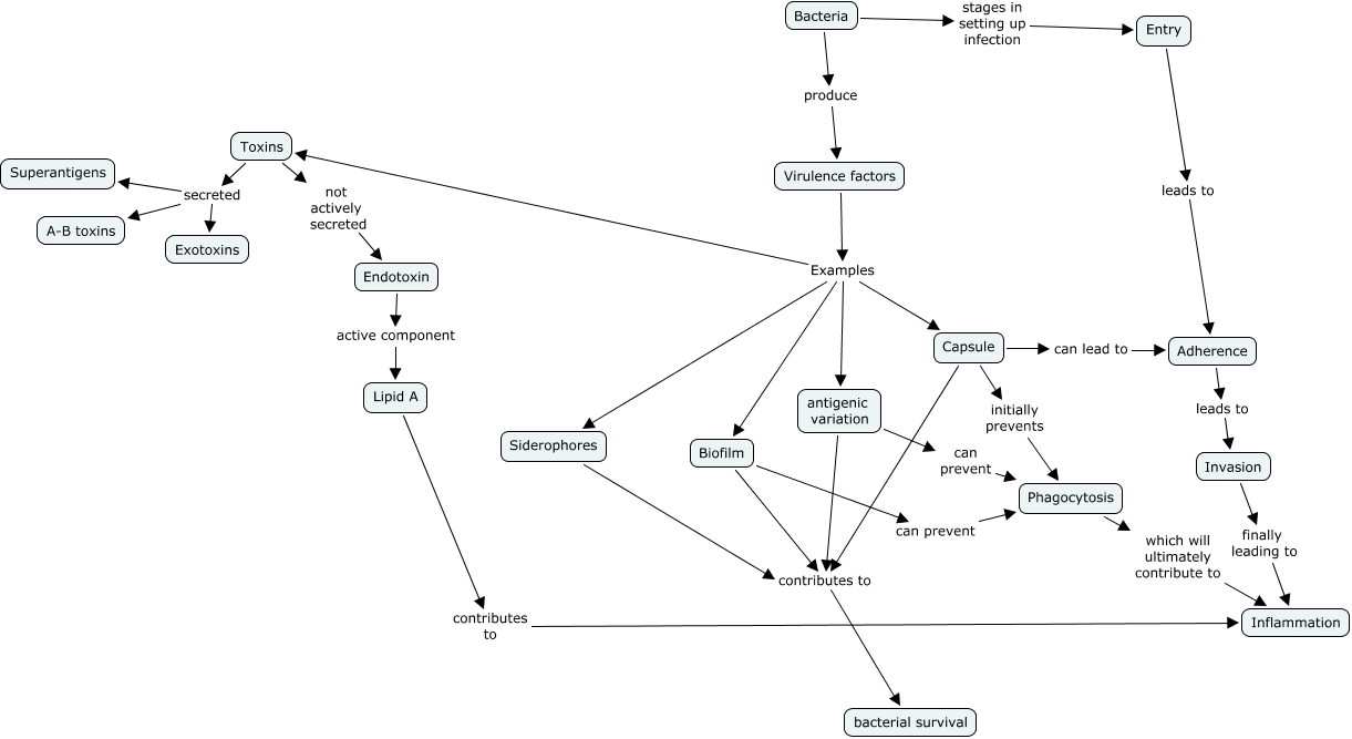 This Concept Map, created with IHMC CmapTools, has information related to: Microbial Pathogenesis, Toxins not actively secreted Endotoxin, Entry leads to Adherence, Toxins secreted A-B toxins, antigenic variation contributes to bacterial survival, Adherence leads to Invasion, antigenic variation can prevent Phagocytosis, Toxins secreted Superantigens, Virulence factors Examples antigenic variation, Bacteria produce Virulence factors, Bacteria stages in setting up infection Entry, Siderophores contributes to bacterial survival, Virulence factors Examples Biofilm, Capsule initially prevents Phagocytosis, Endotoxin active component Lipid A, Capsule contributes to bacterial survival, Biofilm can prevent Phagocytosis, Toxins secreted Exotoxins, Virulence factors Examples Capsule, Phagocytosis which will ultimately contribute to Inflammation, Invasion finally leading to Inflammation