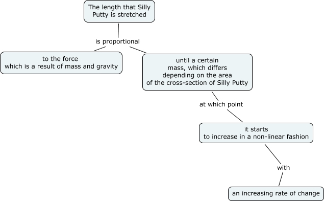 This Concept Map, created with IHMC CmapTools, has information related to: LuandJuliaToyLab2, until a certain mass, which differs depending on the area of the cross-section of Silly Putty at which point it starts to increase in a non-linear fashion, it starts to increase in a non-linear fashion with an increasing rate of change, The length that Silly Putty is stretched is proportional until a certain mass, which differs depending on the area of the cross-section of Silly Putty, The length that Silly Putty is stretched is proportional to the force which is a result of mass and gravity