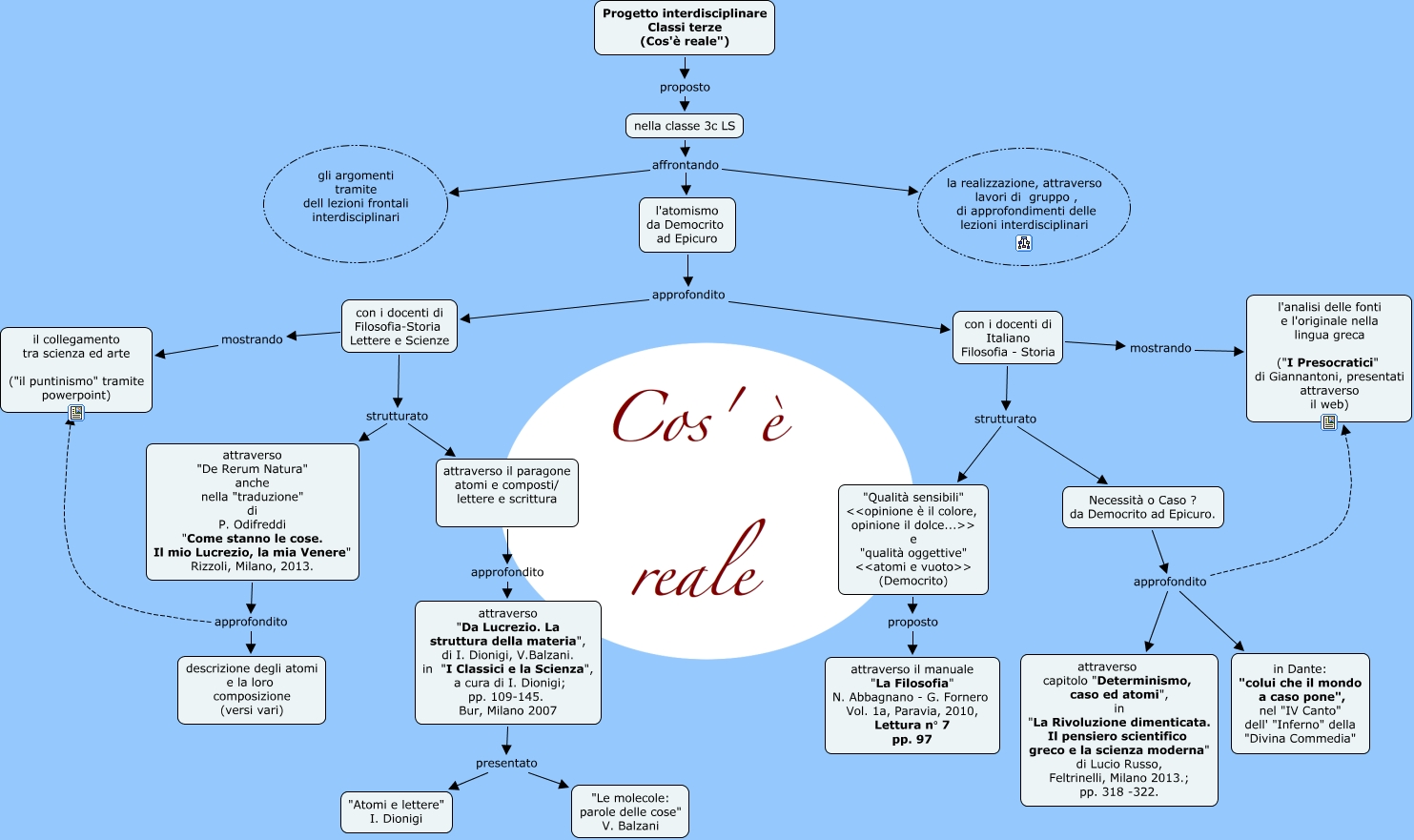 Questa Cmap, creata con IHMC CmapTools, contiene informazioni relative a: proposta classe terza C ls atomismo, Necessità o Caso ? da Democrito ad Epicuro. approfondito l'analisi delle fonti e l'originale nella lingua greca ("I Presocratici" di Giannantoni, presentati attraverso il web), attraverso "De Rerum Natura" anche nella "traduzione" di P. Odifreddi "Come stanno le cose. Il mio Lucrezio, la mia Venere" Rizzoli, Milano, 2013. approfondito il collegamento tra scienza ed arte ("il puntinismo" tramite powerpoint), con i docenti di Italiano Filosofia - Storia strutturato "Qualità sensibili" <<opinione è il colore, opinione il dolce...>> e "qualità oggettive" <<atomi e vuoto>> (Democrito), l'atomismo da Democrito ad Epicuro approfondito con i docenti di Italiano Filosofia - Storia, Progetto interdisciplinare Classi terze (Cos'è reale") proposto nella classe 3c LS, nella classe 3c LS affrontando l'atomismo da Democrito ad Epicuro, con i docenti di Italiano Filosofia - Storia mostrando l'analisi delle fonti e l'originale nella lingua greca ("I Presocratici" di Giannantoni, presentati attraverso il web), Necessità o Caso ? da Democrito ad Epicuro. approfondito in Dante: "colui che il mondo a caso pone", nel "IV Canto" dell' "Inferno" della "Divina Commedia", con i docenti di Filosofia-Storia Lettere e Scienze strutturato attraverso "De Rerum Natura" anche nella "traduzione" di P. Odifreddi "Come stanno le cose. Il mio Lucrezio, la mia Venere" Rizzoli, Milano, 2013., "Qualità sensibili" <<opinione è il colore, opinione il dolce...>> e "qualità oggettive" <<atomi e vuoto>> (Democrito) proposto attraverso il manuale "La Filosofia" N. Abbagnano - G. Fornero Vol. 1a, Paravia, 2010, Lettura n° 7 pp. 97, attraverso "Da Lucrezio. La struttura della materia", di I. Dionigi, V.Balzani. in "I Classici e la Scienza", a cura di I. Dionigi; pp. 109-145. Bur, Milano 2007 presentato "Atomi e lettere" I. Dionigi, nella classe 3c LS affrontando la realizzazione, attraverso lavori di gruppo , di approfondimenti delle lezioni interdisciplinari, attraverso "Da Lucrezio. La struttura della materia", di I. Dionigi, V.Balzani. in "I Classici e la Scienza", a cura di I. Dionigi; pp. 109-145. Bur, Milano 2007 presentato "Le molecole: parole delle cose" V. Balzani, l'atomismo da Democrito ad Epicuro approfondito con i docenti di Filosofia-Storia Lettere e Scienze, con i docenti di Filosofia-Storia Lettere e Scienze mostrando il collegamento tra scienza ed arte ("il puntinismo" tramite powerpoint), attraverso "De Rerum Natura" anche nella "traduzione" di P. Odifreddi "Come stanno le cose. Il mio Lucrezio, la mia Venere" Rizzoli, Milano, 2013. approfondito descrizione degli atomi e la loro composizione (versi vari), con i docenti di Filosofia-Storia Lettere e Scienze strutturato attraverso il paragone atomi e composti/ lettere e scrittura, attraverso il paragone atomi e composti/ lettere e scrittura approfondito attraverso "Da Lucrezio. La struttura della materia", di I. Dionigi, V.Balzani. in "I Classici e la Scienza", a cura di I. Dionigi; pp. 109-145. Bur, Milano 2007, nella classe 3c LS affrontando gli argomenti tramite dell lezioni frontali interdisciplinari, Necessità o Caso ? da Democrito ad Epicuro. approfondito attraverso capitolo "Determinismo, caso ed atomi", in "La Rivoluzione dimenticata. Il pensiero scientifico greco e la scienza moderna" di Lucio Russo, Feltrinelli, Milano 2013.; pp. 318 -322.
