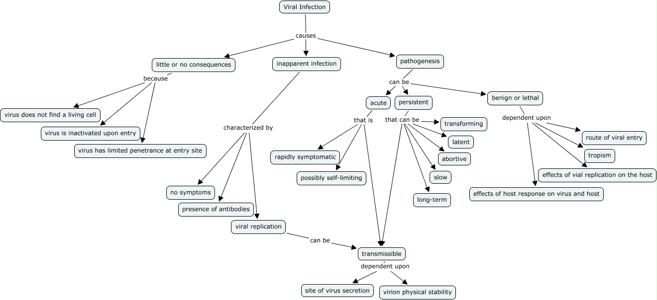 This Concept Map, created with IHMC CmapTools, has information related to: Viral Infection, acute that is transmissible, benign or lethal dependent upon tropism, persistent that can be long-term, acute that is rapidly symptomatic, persistent that can be slow, pathogenesis can be benign or lethal, viral replication can be transmissible, benign or lethal dependent upon effects of vial replication on the host, little or no consequences because virus does not find a living cell, Viral Infection causes little or no consequences, transmissible dependent upon site of virus secretion, acute that is possibly self-limiting, persistent that can be latent, little or no consequences because virus has limited penetrance at entry site, inapparent infection characterized by no symptoms, transmissible dependent upon virion physical stability, benign or lethal dependent upon effects of host response on virus and host, pathogenesis can be persistent, little or no consequences because virus is inactivated upon entry, inapparent infection characterized by viral replication