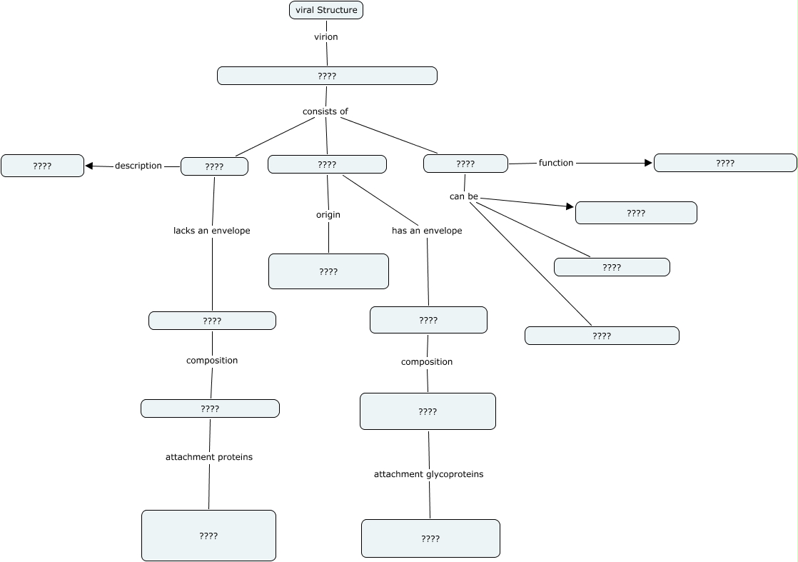 This Concept Map, created with IHMC CmapTools, has information related to: virus structure, ???? composition ????, ???? attachment proteins ????, ???? can be ????, ???? description ????, ???? consists of ????, ???? consists of ????, ???? composition ????, ???? lacks an envelope ????, ???? function ????, ???? has an envelope ????, ???? consists of ????, viral Structure virion ????, ???? can be ????, ???? origin ????, ???? attachment glycoproteins ????, ???? can be ????