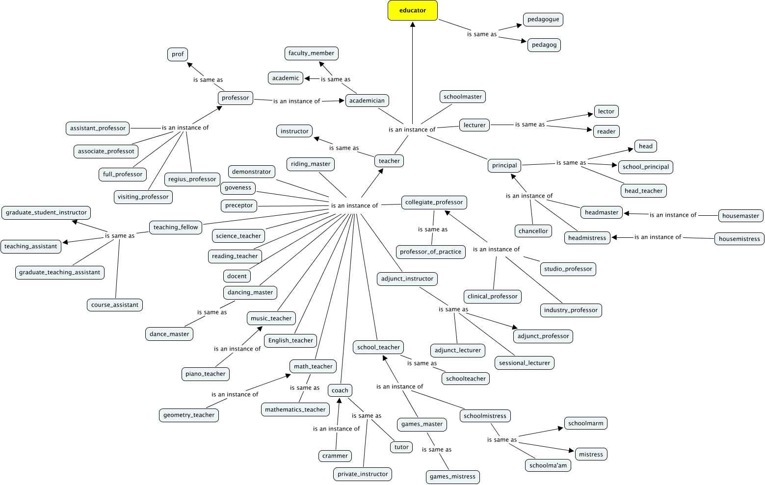 This Concept Map, created with IHMC CmapTools, has information related to: educator, dancing_master is same as dance_master, principal is same as head, associate_professot is an instance of professor, schoolmaster is an instance of educator, dancing_master is an instance of teacher, teaching_fellow is same as course_assistant, chancellor is an instance of principal, lecturer is same as lector, English_teacher is an instance of teacher, coach is an instance of teacher, studio_professor is an instance of collegiate_professor, riding_master is an instance of teacher, educator is same as pedagogue, academician is an instance of educator, regius_professor is an instance of professor, professor is an instance of academician, schoolmistress is same as schoolma'am, teacher is an instance of educator, docent is an instance of teacher, coach is same as tutor