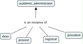 This Concept Map, created with IHMC CmapTools, has information related to: academic administrator, dean is an instance of academic_administrator, president is an instance of academic_administrator, provost is an instance of academic_administrator, registrar is an instance of academic_administrator