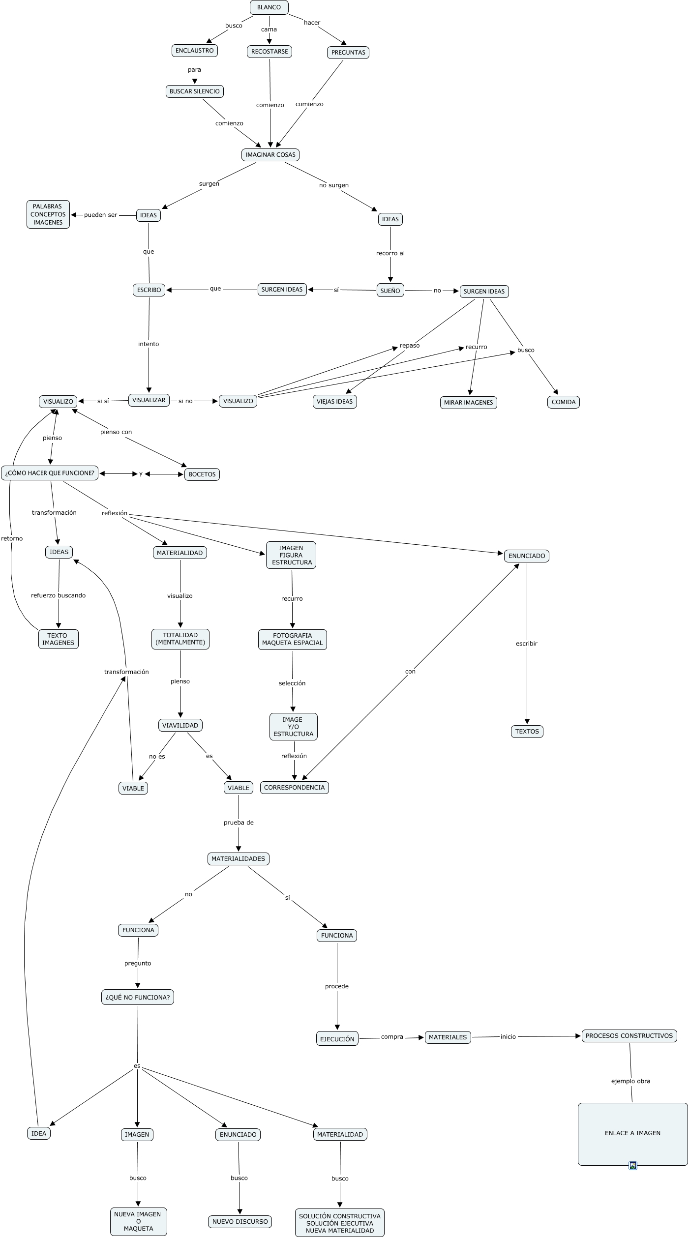 Este Cmap, tiene información relacionada con: Cómo Proyecto Tamara Jacquin, BLANCO busco ENCLAUSTRO, IMAGEN busco NUEVA IMAGEN O MAQUETA, IDEAS pueden ser PALABRAS CONCEPTOS IMAGENES, TOTALIDAD (MENTALMENTE) pienso VIAVILIDAD, ¿CÓMO HACER QUE FUNCIONE? reflexión ENUNCIADO, IMAGEN FIGURA ESTRUCTURA recurro FOTOGRAFIA MAQUETA ESPACIAL, BLANCO cama RECOSTARSE, VIABLE transformación IDEAS, ENUNCIADO escribir TEXTOS, PREGUNTAS comienzo IMAGINAR COSAS, VISUALIZO busco COMIDA, IDEA transformación IDEAS, BUSCAR SILENCIO comienzo IMAGINAR COSAS, VISUALIZO repaso VIEJAS IDEAS, IMAGINAR COSAS no surgen IDEAS, VISUALIZO recurro MIRAR IMAGENES, ¿QUÉ NO FUNCIONA? es IDEA, ENUNCIADO busco NUEVO DISCURSO, SURGEN IDEAS recurro MIRAR IMAGENES, ¿CÓMO HACER QUE FUNCIONE? transformación IDEAS