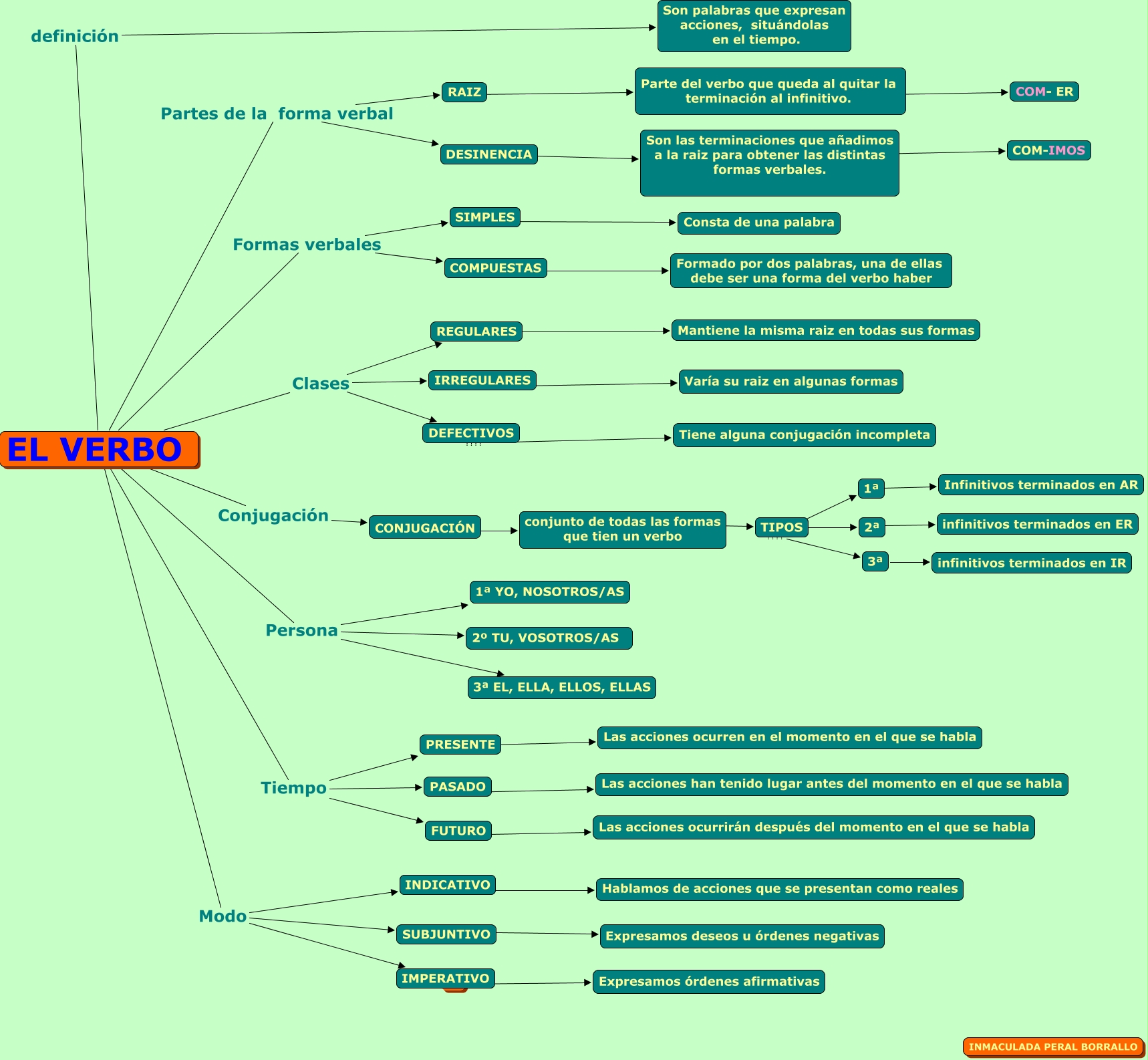 Este Cmap, tiene información relacionada con: EL VERBO.cmap, DEFECTIVOS ???? Tiene alguna conjugación incompleta, Parte del verbo que queda al quitar la terminación al infinitivo. ???? COM- ER, EL VERBO Partes de la forma verbal RAIZ, EL VERBO Tiempo PRESENTE, 1ª ???? Infinitivos terminados en AR, EL VERBO Modo IMPERATIVO, EL VERBO definición Son palabras que expresan acciones, situándolas en el tiempo., TIPOS ???? 1ª, DESINENCIA ???? Son las terminaciones que añadimos a la raiz para obtener las distintas formas verbales., FUTURO ???? Las acciones ocurrirán después del momento en el que se habla, SUBJUNTIVO ???? Expresamos deseos u órdenes negativas, EL VERBO Tiempo PASADO, EL VERBO Conjugación CONJUGACIÓN, IMPERATIVO ???? Expresamos órdenes afirmativas, PRESENTE ???? Las acciones ocurren en el momento en el que se habla, Son las terminaciones que añadimos a la raiz para obtener las distintas formas verbales. ???? COM-IMOS, 2ª ???? infinitivos terminados en ER, TIPOS ???? 3ª, EL VERBO Persona 1ª YO, NOSOTROS/AS, REGULARES ???? Mantiene la misma raiz en todas sus formas