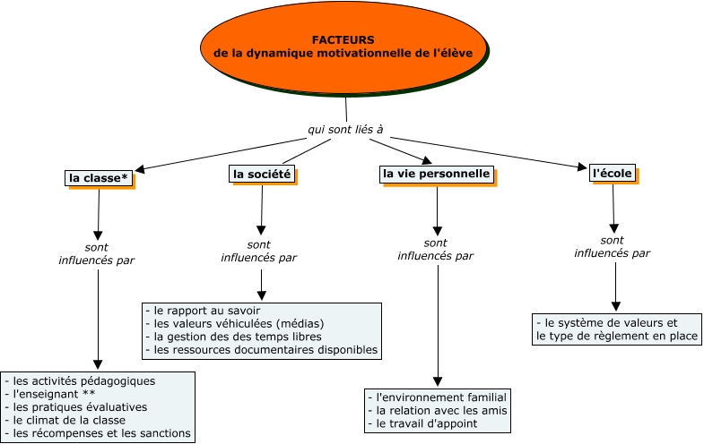 Cette carte de concepts créée avec IHMC CmapTools traite de: PED853_Facteurs, FACTEURS de la dynamique motivationnelle de l'élève qui sont liés à la classe*, FACTEURS de la dynamique motivationnelle de l'élève qui sont liés à la société, la vie personnelle sont influencés par - l'environnement familial - la relation avec les amis - le travail d'appoint, la classe* sont influencés par - les activités pédagogiques - l'enseignant ** - les pratiques évaluatives - le climat de la classe - les récompenses et les sanctions, l'école sont influencés par - le système de valeurs et le type de règlement en place, FACTEURS de la dynamique motivationnelle de l'élève qui sont liés à l'école, FACTEURS de la dynamique motivationnelle de l'élève qui sont liés à la vie personnelle, la société sont influencés par - le rapport au savoir - les valeurs véhiculées (médias) - la gestion des des temps libres - les ressources documentaires disponibles