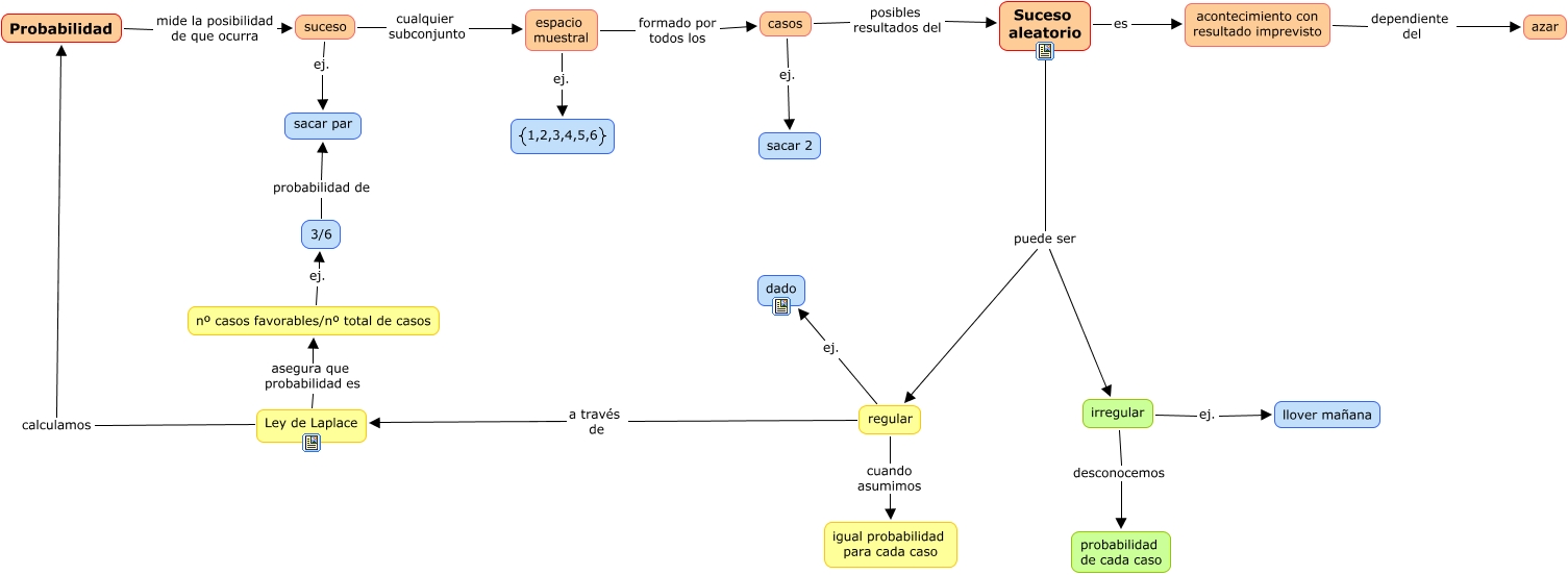 Este Cmap, tiene información relacionada con: Azar y probabilidad, Suceso aleatorio puede ser irregular, Suceso aleatorio puede ser regular, espacio muestral ej. <math xmlns="http://www.w3.org/1998/Math/MathML"> <mrow> <mfenced open="{" close="}"> <mtext> 1,2,3,4,5,6 </mtext> </mfenced> </mrow> </math>, regular ej. dado, irregular desconocemos probabilidad de cada caso, acontecimiento con resultado imprevisto dependiente del azar, suceso ej. sacar par, suceso cualquier subconjunto espacio muestral, casos ej. sacar 2, nº casos favorables/nº total de casos ej. 3/6, Suceso aleatorio es acontecimiento con resultado imprevisto, Ley de Laplace calculamos Probabilidad, espacio muestral formado por todos los casos, Ley de Laplace asegura que probabilidad es nº casos favorables/nº total de casos, regular a través de Ley de Laplace, Probabilidad mide la posibilidad de que ocurra suceso, 3/6 probabilidad de sacar par, casos posibles resultados del Suceso aleatorio, irregular ej. llover mañana, regular cuando asumimos igual probabilidad para cada caso
