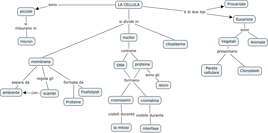Questa Cmap, creata con IHMC CmapTools, contiene informazioni relative a: La cellula, proteine sono gli istoni, cromatina visibile durante interfase, membrana formata da Proteine, proteine formano cromosomi, cromosomi visibili durante la mitosi, membrana regola gli scambi, Eucariote sono Animale, LA CELLULA è di due tipi Eucariote, membrana separa da ambiente, proteine formano cromatina, membrana formata da Fosfolipidi, LA CELLULA sono piccole, DNA formano cromosomi, DNA formano cromatina, piccole si misurano in micron, Vegetali presentano Parete cellulare, LA CELLULA si divide in nucleo, scambi con ambiente, Eucariote sono Vegetali, nucleo contiene proteine