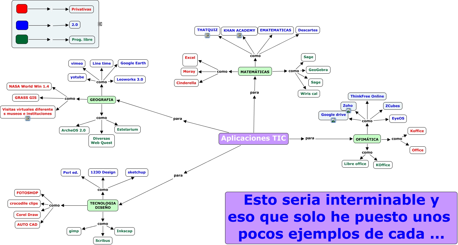 Este Cmap, tiene información relacionada con: Aplicaciones TIC, TECNOLOGIA DISEÑO como crocodile clips, TECNOLOGIA DISEÑO como 123D Design, GEOGRAFIA como vimeo, GEOGRAFIA como yotube, MATEMÀTICAS como Cinderella, Prog. libre, MATEMÀTICAS como Excel, OFIMÁTICA como Libre office, Privativas, GEOGRAFIA como Line time, OFIMÁTICA como EyeOS, TECNOLOGIA DISEÑO como sketchup, MATEMÀTICAS como GeoGebra, Aplicaciones TIC para OFIMÁTICA, MATEMÀTICAS como Sage, TECNOLOGIA DISEÑO como gimp, TECNOLOGIA DISEÑO como Scribus, TECNOLOGIA DISEÑO como Corel Draw, GEOGRAFIA como Diversas Web Quest, MATEMÀTICAS como KHAN ACADEMY