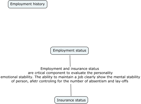 This Concept Map, created with IHMC CmapTools, has information related to: Economic domain, Employment status Employment and insurance status are crtical component to evaluate the personality emotional stability. The ability to maintain a job clearly show the mental stability of person, afetr controling for the number of absentism and lay-offs Insurance status