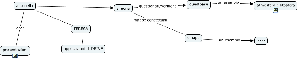 Questa Cmap, creata con IHMC CmapTools, contiene informazioni relative a: mappa corso Lim, simona mappe concettuali cmaps, simona questionari/verifiche questbase, TERESA applicazioni di DRIVE, antonella TERESA, questbase un esempio atmosfera e litosfera, cmaps un esempio ????, antonella simona, antonella ???? presentazioni