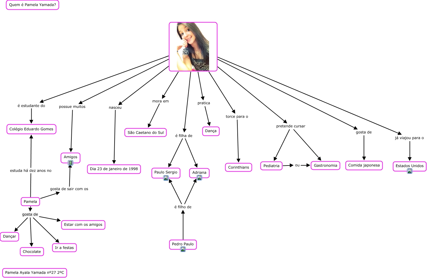 Esse mapa conceitual, produzido no IHMC CmapTools, tem a informação relacionada a: Pamela Yamada nº27 2ºC, é filha de Adriana, Pamela gosta de Ir a festas, mora em São Caetano do Sul, possue muitos Amigos, pretende cursar Pediatria, é filha de Paulo Sergio, Pedro Paulo é filho de Adriana, Pediatria ou Gastronomia, pretende cursar Gastronomia, Pedro Paulo é filho de Paulo Sergio, é estudante do Colégio Eduardo Gomes, torce para o Corinthians, Pamela estuda há dez anos no Colégio Eduardo Gomes, nasceu Dia 23 de janeiro de 1998, pratica Dança, gosta de Comida japonesa, Pamela gosta de sair com os Amigos, Pamela gosta de Dançar, já viajou para o Estados Unidos, Pamela gosta de Estar com os amigos