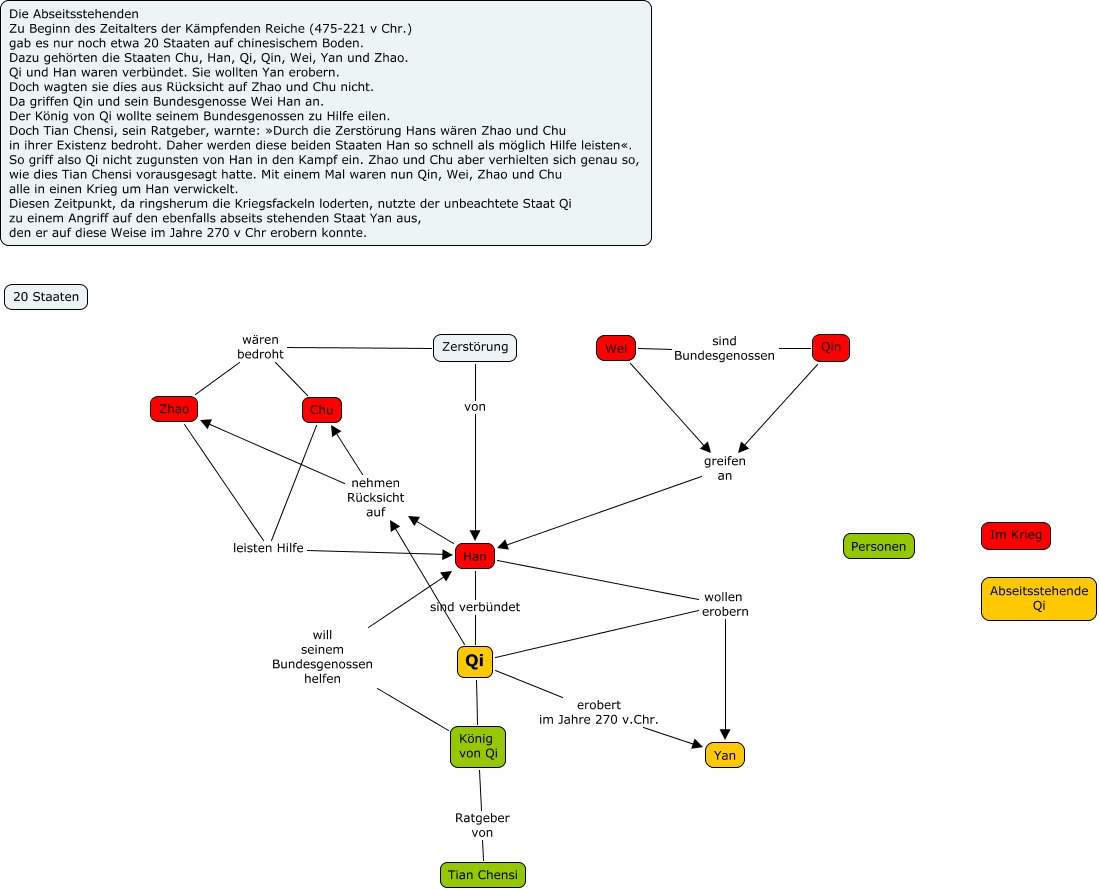 Dieses mit IHMC CmapTools erstellte CMap hat Informationen bezüglich: Strategem1, Qin sind Bundesgenossen Wei, Zerstörung wären bedroht Zhao, Qin greifen an Han, Zerstörung wären bedroht Chu, Zerstörung von Han, Han sind verbündet Qi, Chu leisten Hilfe Han, Zhao leisten Hilfe Han, Qi wollen erobern Yan, Qi nehmen Rücksicht auf Zhao, Qi König von Qi, König von Qi Ratgeber von Tian Chensi, König von Qi will seinem Bundesgenossen helfen Han, Wei greifen an Han, Han nehmen Rücksicht auf Chu, Qi erobert im Jahre 270 v.Chr. Yan, Han nehmen Rücksicht auf Zhao, Han wollen erobern Yan, Qi nehmen Rücksicht auf Chu
