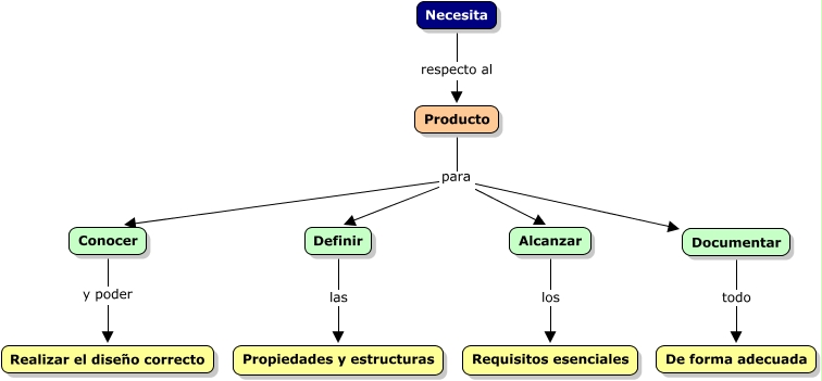 Este Cmap, tiene información relacionada con: Necesita, Producto para Documentar, Alcanzar los Requisitos esenciales, Producto para Definir, Producto para Alcanzar, Necesita respecto al Producto, Definir las Propiedades y estructuras, Producto para Conocer, Documentar todo De forma adecuada, Conocer y poder Realizar el diseño correcto