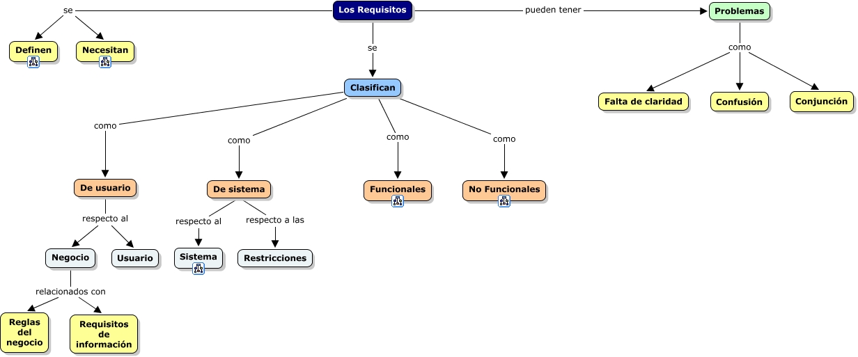 Este Cmap, tiene información relacionada con: Requisito, Los Requisitos se Definen, Negocio relacionados con Requisitos de información, De usuario respecto al Usuario, De sistema respecto al Sistema, Problemas como Falta de claridad, Los Requisitos se Necesitan, Los Requisitos se Clasifican, De sistema respecto a las Restricciones, Clasifican como De sistema, Problemas como Conjunción, Clasifican como Funcionales, Negocio relacionados con Reglas del negocio, Los Requisitos pueden tener Problemas, Clasifican como De usuario, Clasifican como No Funcionales, Problemas como Confusión, De usuario respecto al Negocio