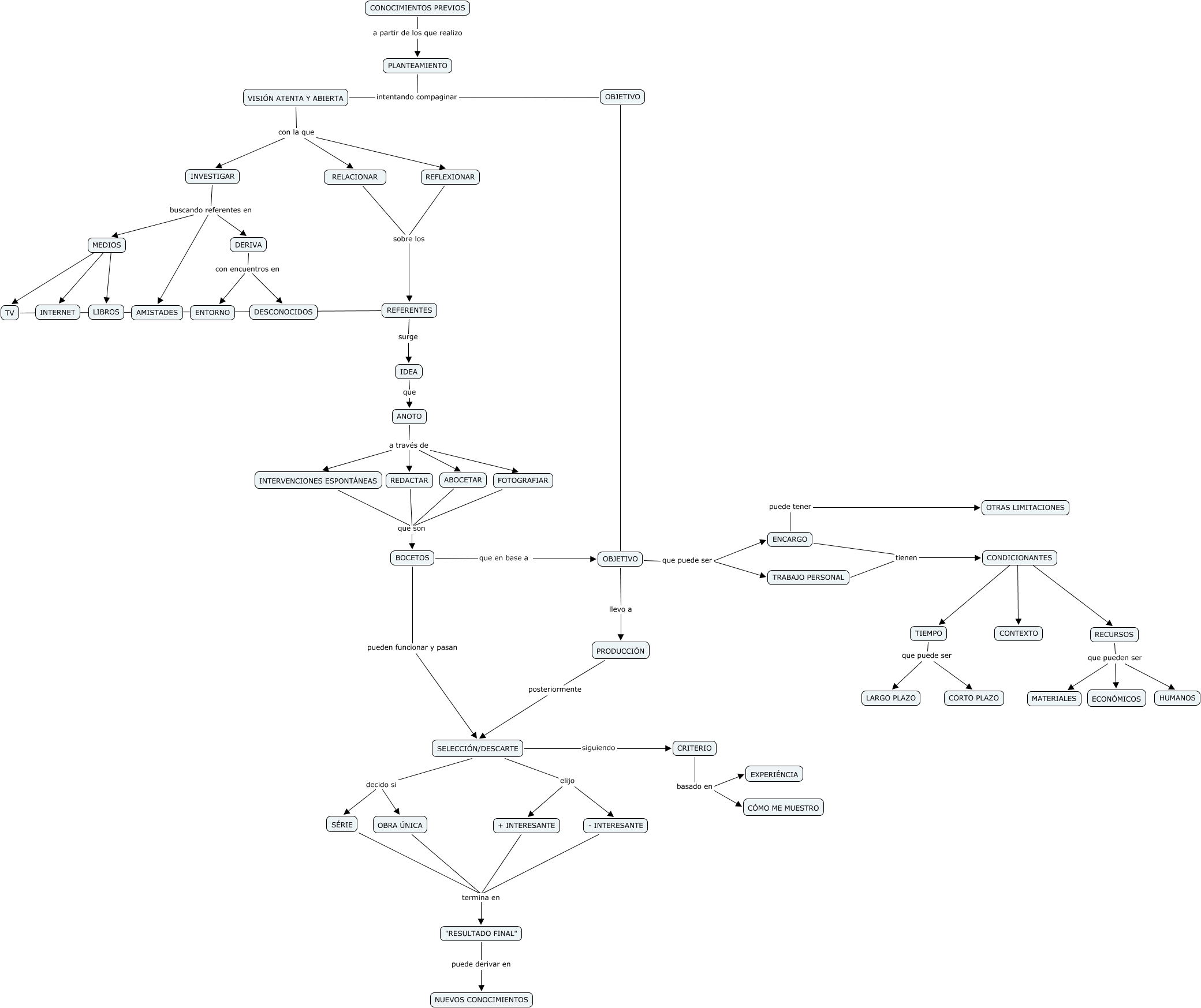 Este Cmap, tiene información relacionada con: Darío Cobacho - Cómo proyecto, RECURSOS que pueden ser MATERIALES, OBJETIVO ???? OBJETIVO, PRODUCCIÓN posteriormente SELECCIÓN/DESCARTE, + INTERESANTE termina en "RESULTADO FINAL", INVESTIGAR buscando referentes en MEDIOS, MEDIOS ???? LIBROS, SELECCIÓN/DESCARTE elijo - INTERESANTE, - INTERESANTE termina en "RESULTADO FINAL", SELECCIÓN/DESCARTE decido si OBRA ÚNICA, TV ???? REFERENTES, RELACIONAR sobre los REFERENTES, MEDIOS ???? TV, ANOTO a través de REDACTAR, INVESTIGAR buscando referentes en DERIVA, INTERVENCIONES ESPONTÁNEAS que son BOCETOS, ENCARGO puede tener OTRAS LIMITACIONES, ANOTO a través de ABOCETAR, VISIÓN ATENTA Y ABIERTA con la que RELACIONAR, REDACTAR que son BOCETOS, PLANTEAMIENTO intentando compaginar VISIÓN ATENTA Y ABIERTA