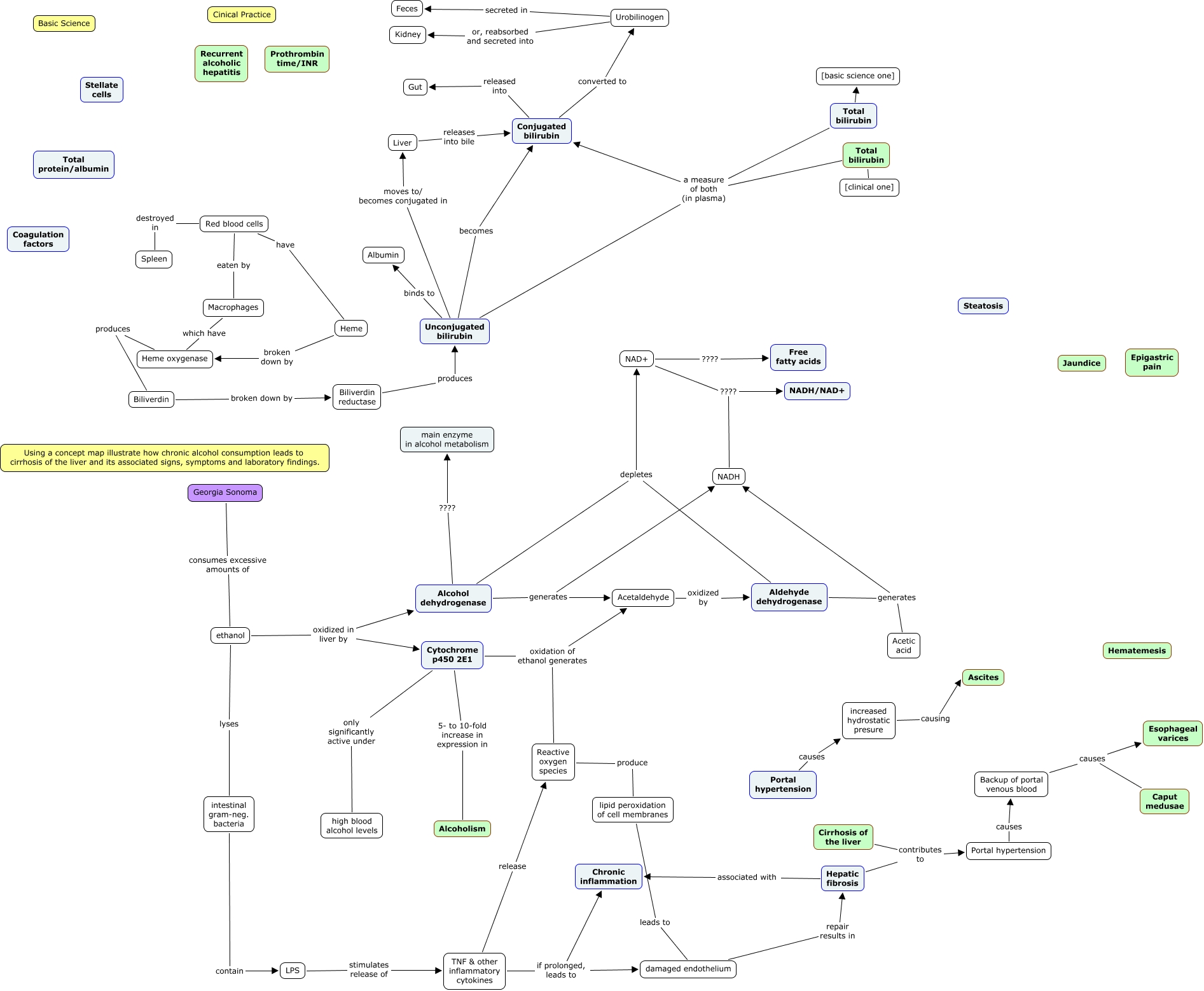 This Concept Map, created with IHMC CmapTools, has information related to: A7 Week 31 Georgia Sonoma, Aldehyde dehydrogenase depletes NAD+, Cytochrome p450 2E1 5- to 10-fold increase in expression in Alcoholism, Cytochrome p450 2E1 oxidation of ethanol generates Acetaldehyde, Red blood cells have Heme, NAD+ ???? Free fatty acids, Backup of portal venous blood causes Caput medusae, Cytochrome p450 2E1 only significantly active under high blood alcohol levels, Alcohol dehydrogenase depletes NAD+, Urobilinogen secreted in Feces, Unconjugated bilirubin binds to Albumin, Total bilirubin [basic science one], Conjugated bilirubin released into Gut, TNF & other inflammatory cytokines if prolonged, leads to Chronic inflammation, NADH ???? NADH/NAD+, ethanol oxidized in liver by Cytochrome p450 2E1, TNF & other inflammatory cytokines if prolonged, leads to damaged endothelium, lipid peroxidation of cell membranes leads to damaged endothelium, Biliverdin reductase produces Unconjugated bilirubin, ethanol lyses intestinal gram-neg. bacteria, LPS stimulates release of TNF & other inflammatory cytokines