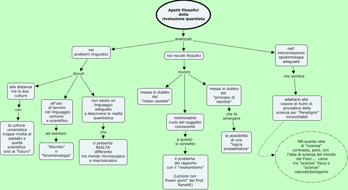 Questa Cmap, creata con IHMC CmapTools, contiene informazioni relative a: lezione quanti filofisica, all'uso di termini nel linguaggio comune e scientifico ad esempio "discreto" o "fenomenologia", Apetti filosofici della rivoluzione quantista analizzati nei problemi linguistici, nei risvolti filosofici ovvero messa in dubbio del "principio di identità", nei risvolti filosofici ovvero messa in dubbio del "nesso causale", nell' interpretazione epistemologia adeguata che sembra adattarsi alla visione di Kuhn di procedere della scienza per "Paradigmi" inconciliabili, messa in dubbio del "principio di identità" che fa emergere la possibilità di una "logica probabilistica", ineliminabile ruolo del soggetto conoscente a questo si connette il problema del rapporto con il "neokantismo" (Lezione con Power point" del Prof. Ranaldi), Apetti filosofici della rivoluzione quantista analizzati nei risvolti filosofici, non esiste un linguaggio adeguato a descrivere la realtà quantistica che ci presenta REALTA' differente tra mondo microscopico e macroscopico, nei problemi linguistici dovuti non esiste un linguaggio adeguato a descrivere la realtà quantistica, nei risvolti filosofici ovvero ineliminabile ruolo del soggetto conoscente, alla distanza tra le due culture con la cultura umanistica troppa rivolta al passato e quella scientifica solo al "futuro", nei problemi linguistici dovuti all'uso di termini nel linguaggio comune e scientifico, nei problemi linguistici dovuti alla distanza tra le due culture, Apetti filosofici della rivoluzione quantista analizzati nell' interpretazione epistemologia adeguata, adattarsi alla visione di Kuhn di procedere della scienza per "Paradigmi" inconciliabili NB:questa idea di "scienza" contrasta, però, con l'idea di scienza del mondo dei Fisici.... come tra "scienza" fisica e "scienze" naturali/biologiche