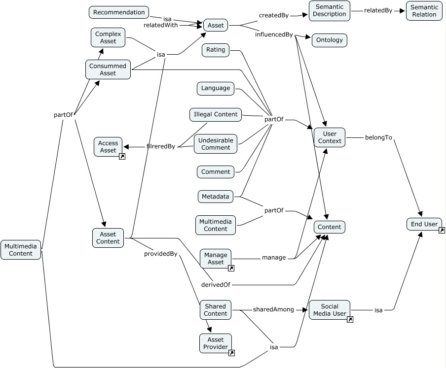 This Concept Map, created with IHMC CmapTools, has information related to: 5.00 Asset, Multimedia Content partOf Asset Content, Multimedia Content isa Content, Language partOf User Context, Shared Content sharedAmong Social Media User, Manage Asset manage User Context, Comment partOf User Context, Asset Content providedBy Asset Provider, Multimedia Content partOf Complex Asset, Complex Asset isa Asset, Asset influencedBy User Context, User Context belongTo End User, Asset Content isa Asset, Manage Asset manage Content, Metadata partOf User Context, Recommendation isa Asset, Asset influencedBy Ontology, Asset createdBy Semantic Description, Consummed Asset partOf User Context, Undesirable Comment partOf User Context, Undesirable Comment filreredBy Access Asset