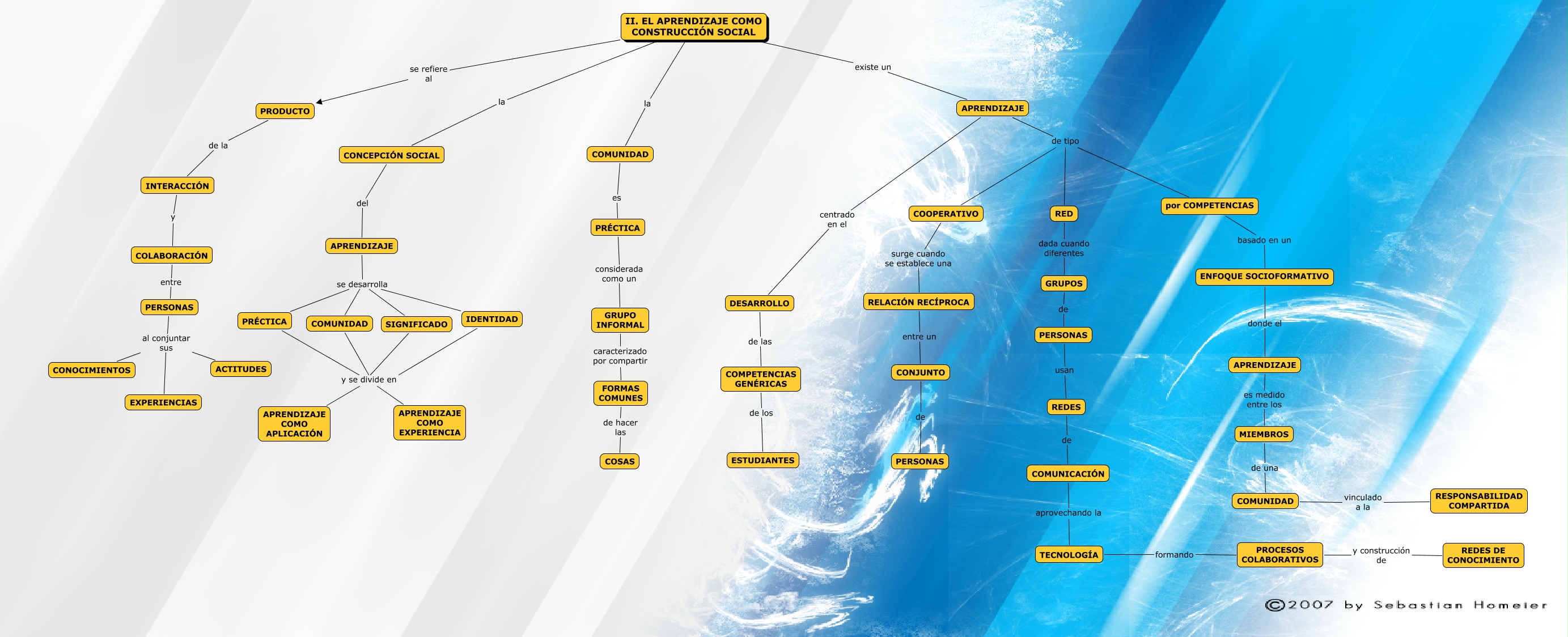 Este Cmap, tiene información relacionada con: Cap 2, COMUNIDAD y se divide en APRENDIZAJE COMO EXPERIENCIA, APRENDIZAJE de tipo RED, PROCESOS COLABORATIVOS y construcción de REDES DE CONOCIMIENTO, APRENDIZAJE de tipo por COMPETENCIAS, GRUPOS de PERSONAS, II. EL APRENDIZAJE COMO CONSTRUCCIÓN SOCIAL la CONCEPCIÓN SOCIAL, FORMAS COMUNES de hacer las COSAS, PRÉCTICA considerada como un GRUPO INFORMAL, RED dada cuando diferentes GRUPOS, PERSONAS al conjuntar sus EXPERIENCIAS, II. EL APRENDIZAJE COMO CONSTRUCCIÓN SOCIAL se refiere al PRODUCTO, ENFOQUE SOCIOFORMATIVO donde el APRENDIZAJE, APRENDIZAJE se desarrolla COMUNIDAD, CONJUNTO de PERSONAS, SIGNIFICADO y se divide en APRENDIZAJE COMO APLICACIÓN, TECNOLOGÍA formando PROCESOS COLABORATIVOS, APRENDIZAJE se desarrolla PRÉCTICA, II. EL APRENDIZAJE COMO CONSTRUCCIÓN SOCIAL la COMUNIDAD, COMUNIDAD vinculado a la RESPONSABILIDAD COMPARTIDA, COMUNIDAD y se divide en APRENDIZAJE COMO APLICACIÓN