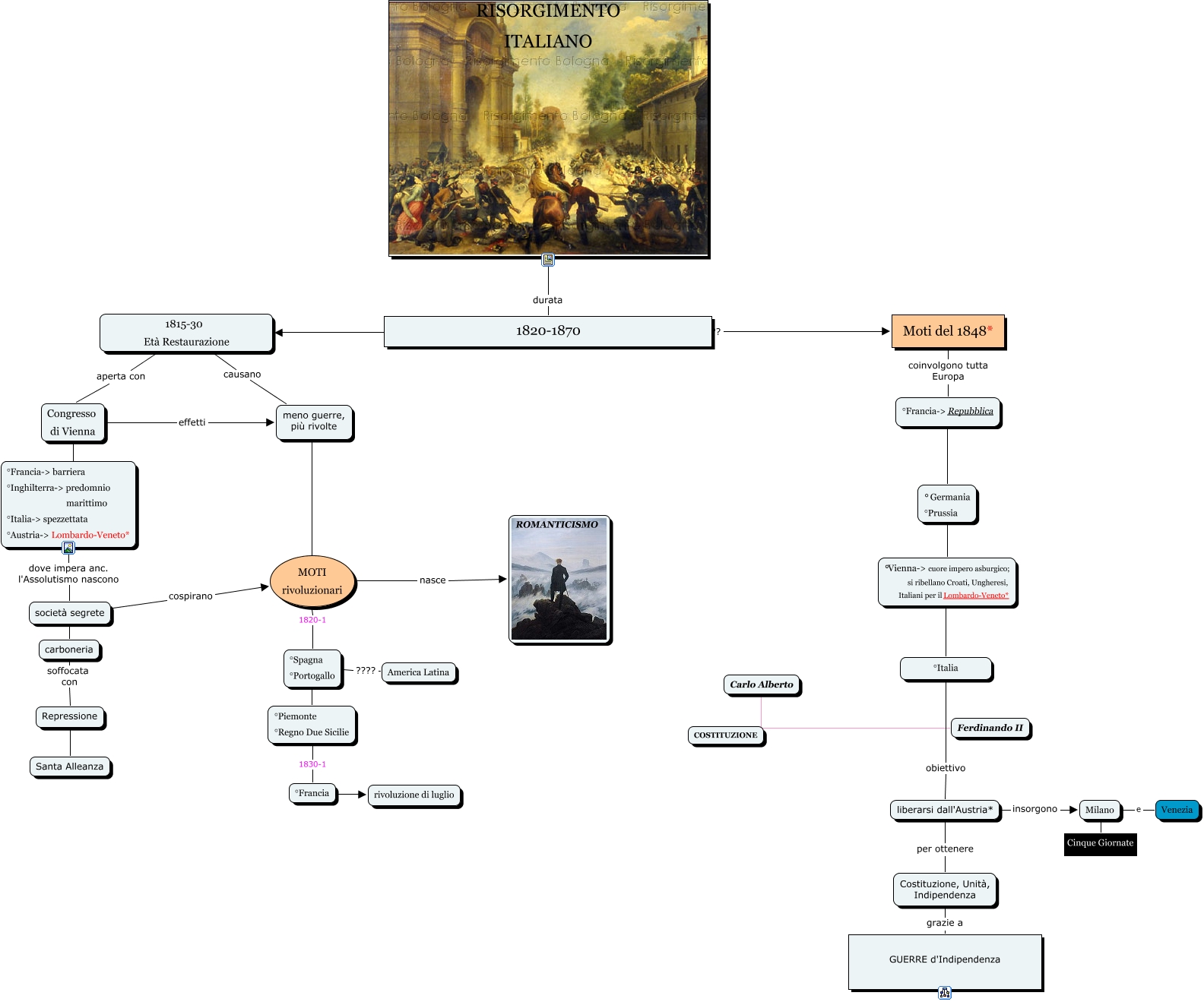 Questa Cmap, creata con IHMC CmapTools, contiene informazioni relative a: Situazione Risorgimentale, Congresso di Vienna ???? °Francia-> barriera °Inghilterra-> predomnio marittimo °Italia-> spezzettata °Austria-> Lombardo-Veneto*, °Francia-> Repubblica ???? ° Germania °Prussia, MOTI rivoluzionari 1820-1 °Spagna °Portogallo, società segrete cospirano MOTI rivoluzionari, Repressione ???? Santa Alleanza, °Italia obiettivo liberarsi dall'Austria*, °Spagna °Portogallo ???? America Latina, liberarsi dall'Austria* insorgono Milano, liberarsi dall'Austria* per ottenere Costituzione, Unità, Indipendenza, Moti del 1848* coinvolgono tutta Europa °Francia-> Repubblica, Milano ???? Cinque Giornate, °Francia ???? rivoluzione di luglio, 1820-1870 ???? 1815-30 Età Restaurazione, meno guerre, più rivolte ???? MOTI rivoluzionari, società segrete ???? carboneria, carboneria soffocata con Repressione, 1815-30 Età Restaurazione aperta con Congresso di Vienna, Carlo Alberto ???? Ferdinando II, Congresso di Vienna effetti meno guerre, più rivolte, 1815-30 Età Restaurazione causano meno guerre, più rivolte